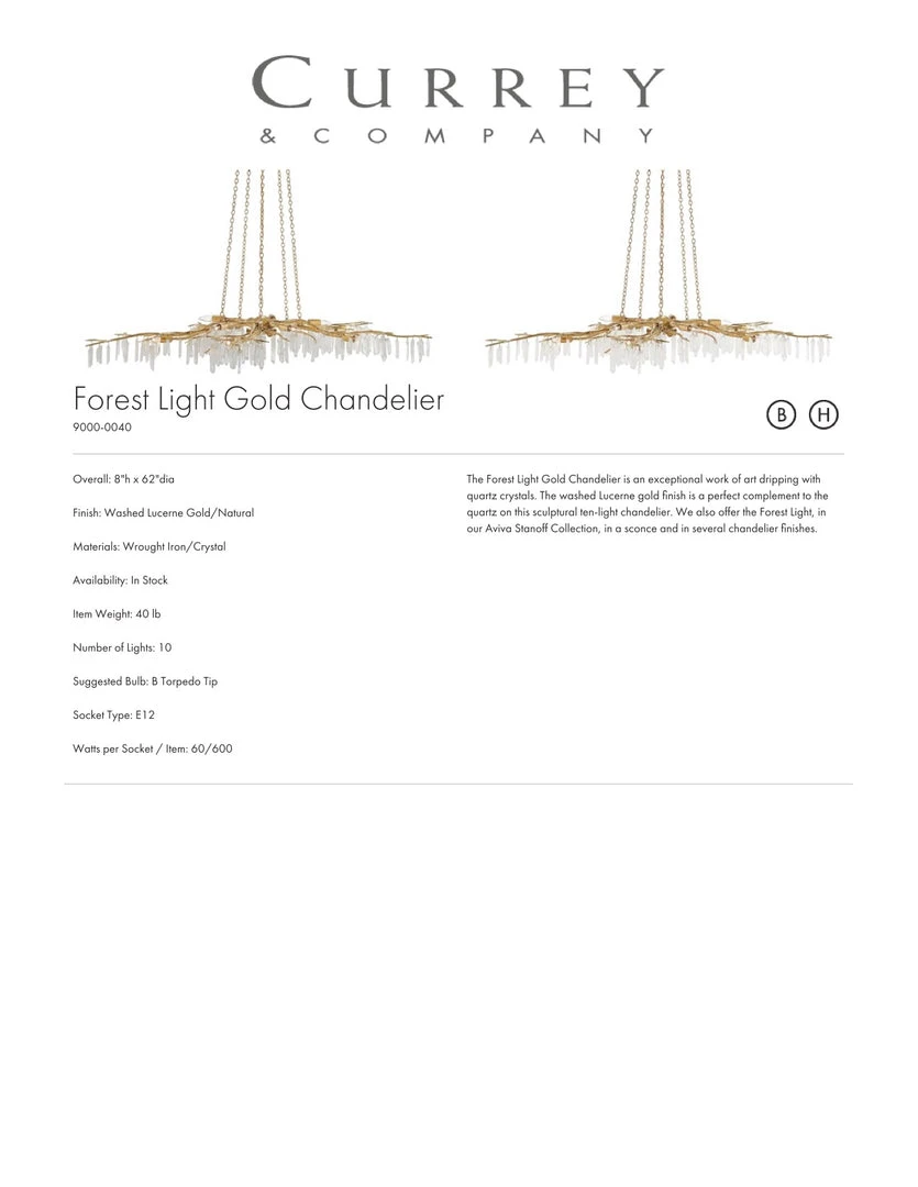 | Materials | Wrought Iron; Washed Lucerne Gold Finish; Natural Crystal; Requires Ten 60watt Candelabra Bulbs |