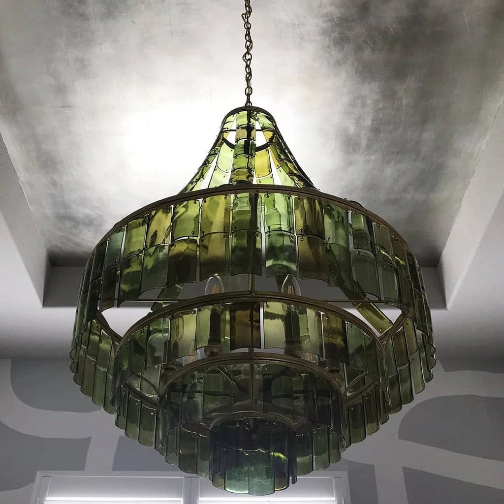 The classic shape of the stunningly beautiful Vintner Chandelier from Currey and Company is the last traditional thing about it! Individually cut pieces of recycled win bottles in naturally varying shades of green hang gracefully from a gold leaf finished iron frame. Ideally suited for foyers, great rooms and living rooms!