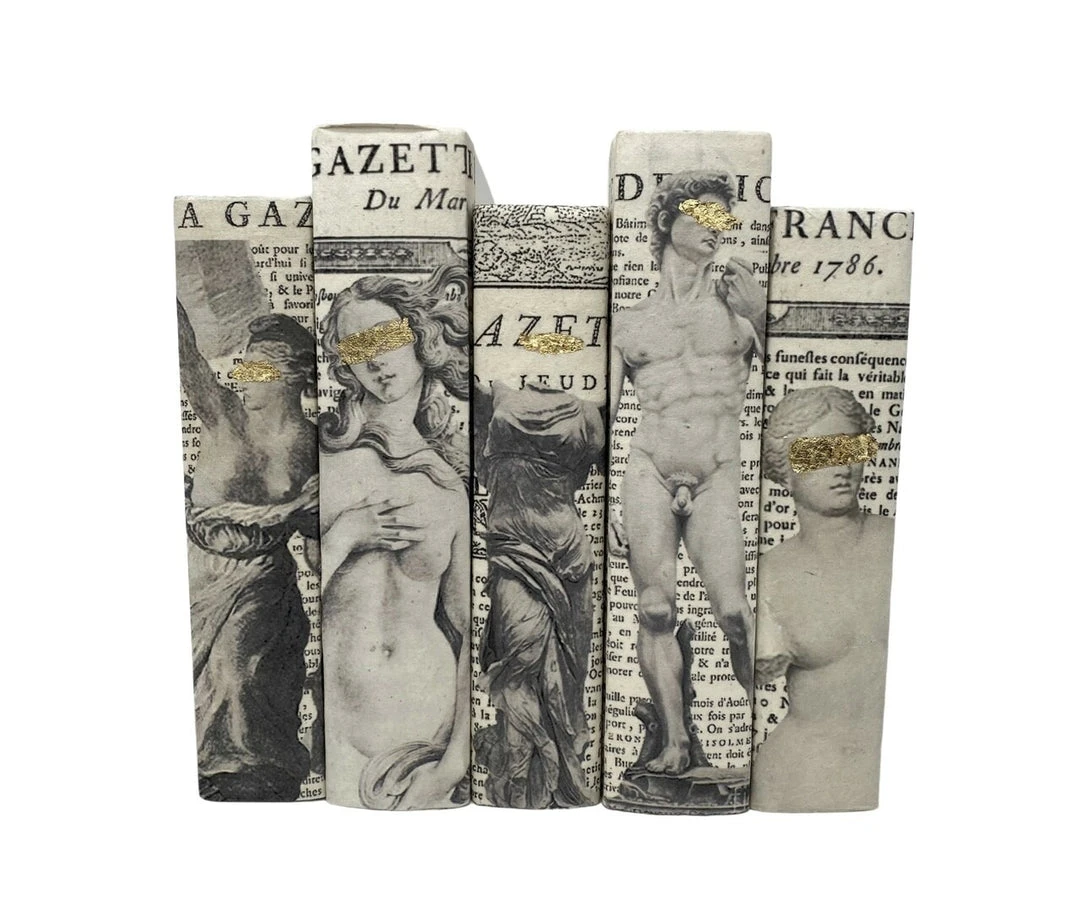 The Gold Redaction Off White Book Set of 5 from E Lawrence features a chic design highlighted with gold detailing. The hand made design is printed on parchment paper and adhered to the spines of the books. The high-end look is soft and somewhat aged looking, while at the same time, making use of recycled books in an ever so stylish fashion. *Made to Order – Please allow 4 weeks.