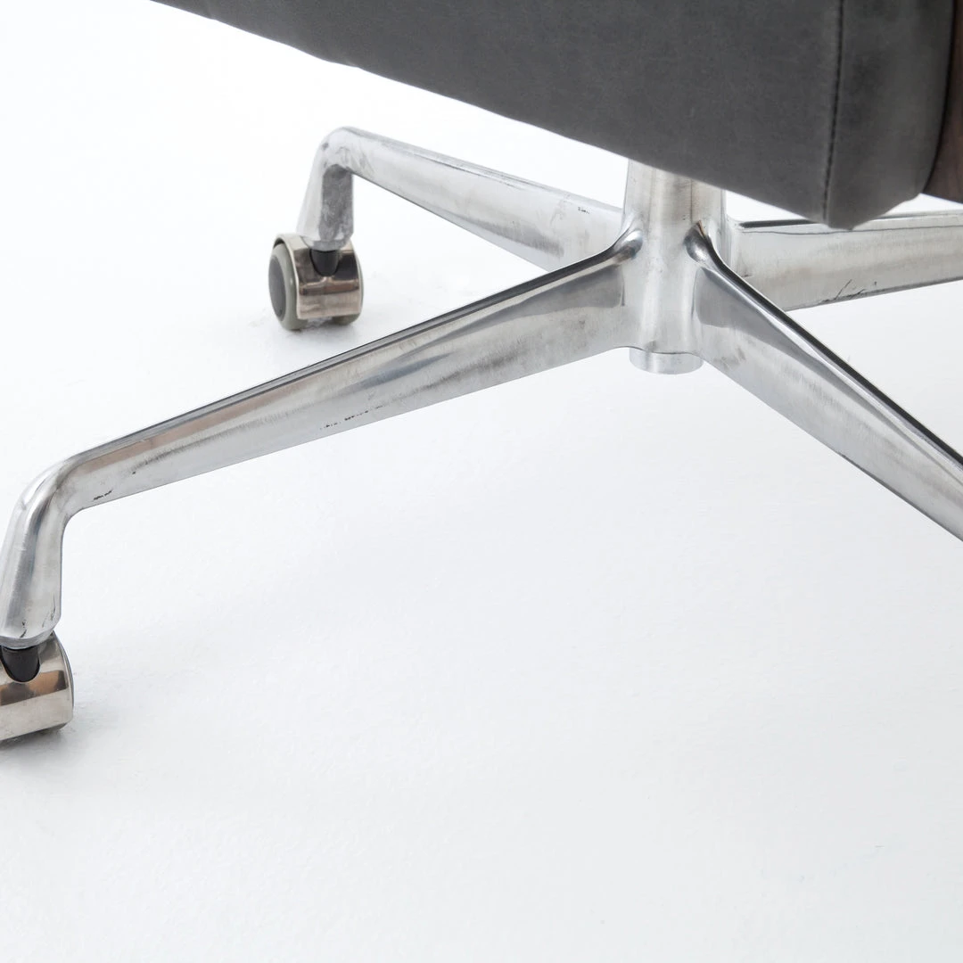 The Bryson Desk Chair in Chaps Ebony from Four Hands offers sleek black, top grain leather covering a sculpted seat and back which seemingly floats inside an elegantly arched, solid oak frame. Metal casters make for ease in the workplace. The Bryson is perfect for commercial settings and home office alike. *Height not adjustable.