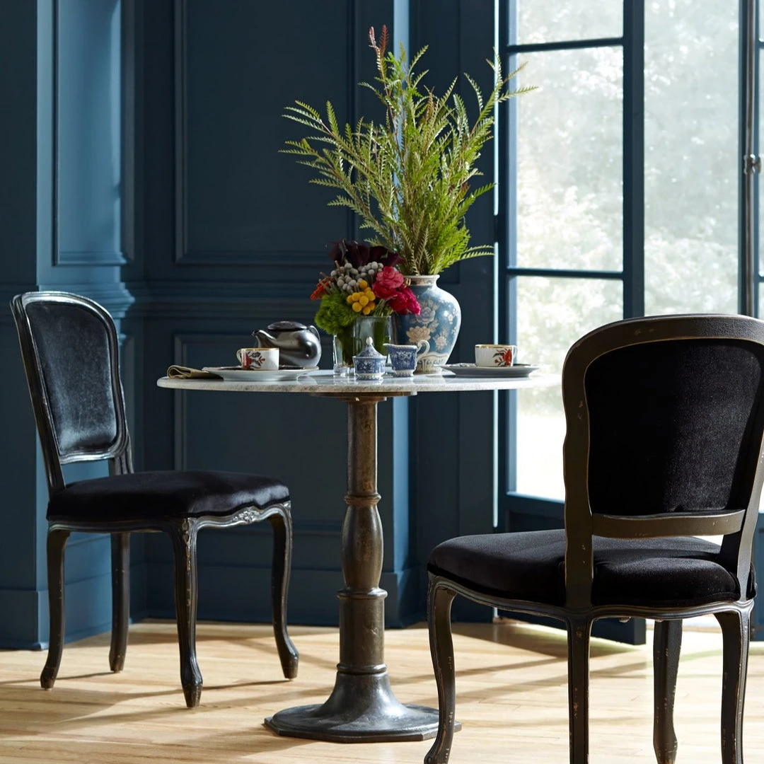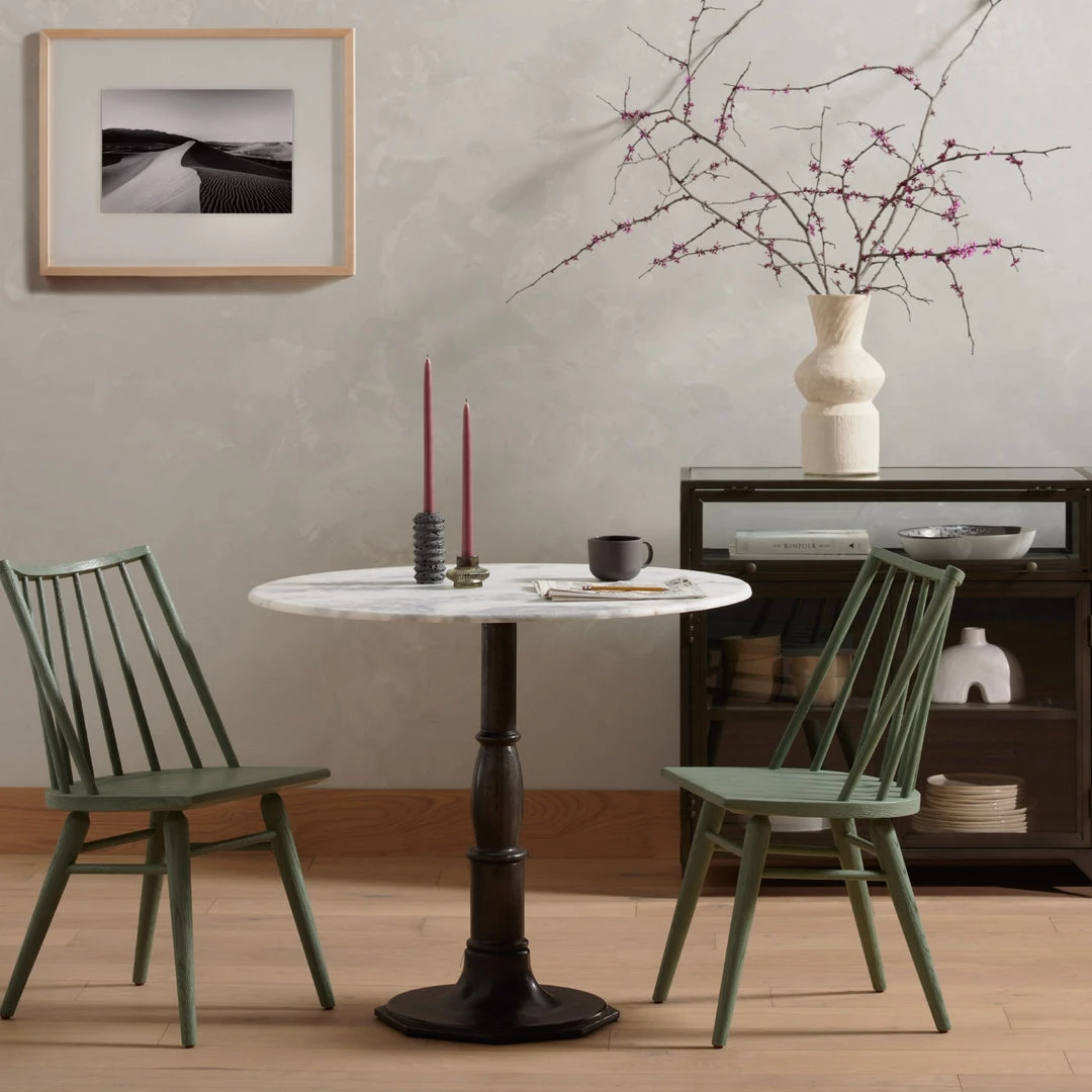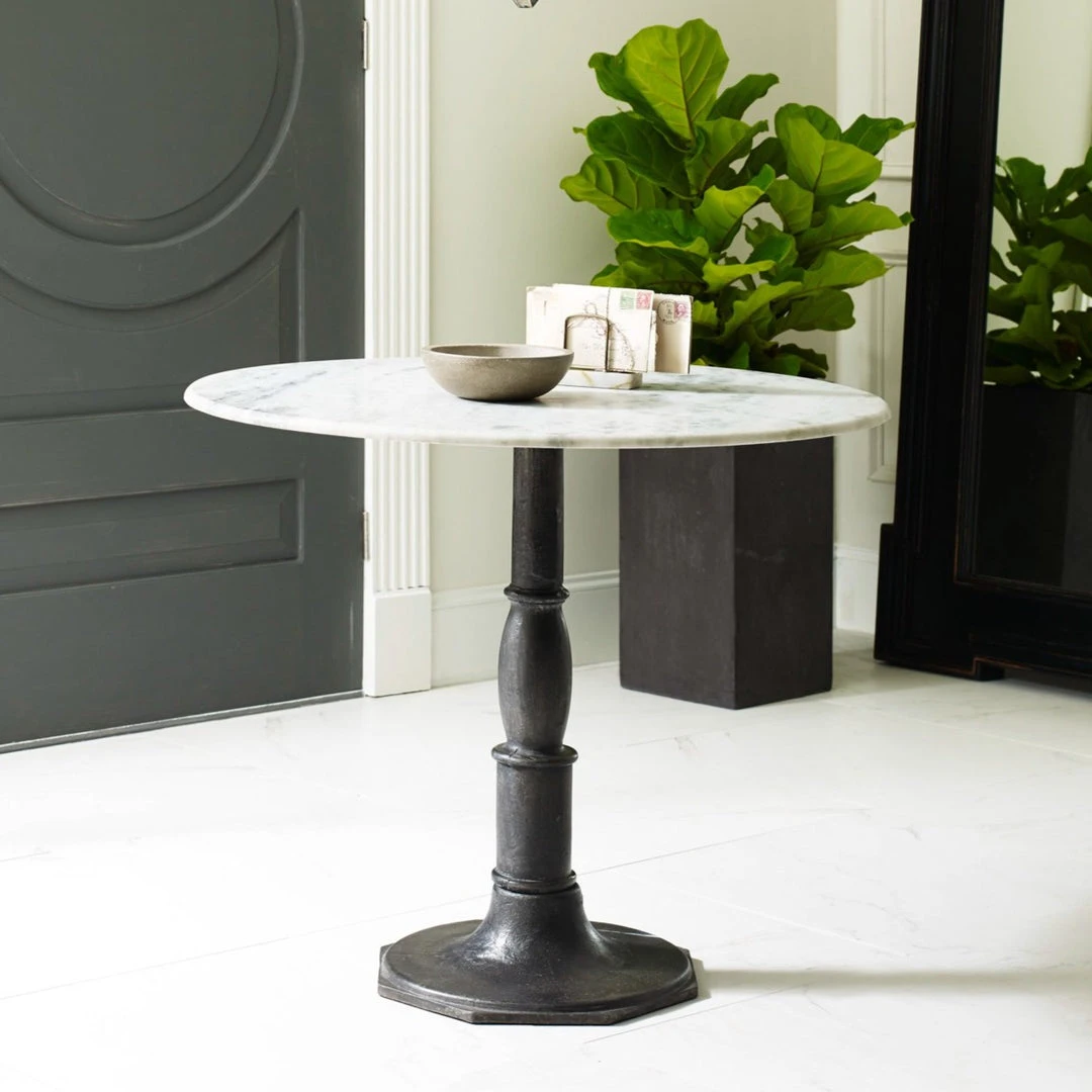 French-industrial meets bistro table with the Lucy Bistro Table in Carbon Wash from Four Hands. A detailed, 8-sided cast iron pedestal supports a dramatic white marble top with a bull-nosed edge. The Lucy adds a perfect touch of charm to kitchen nooks, small entryways, and dining spaces.