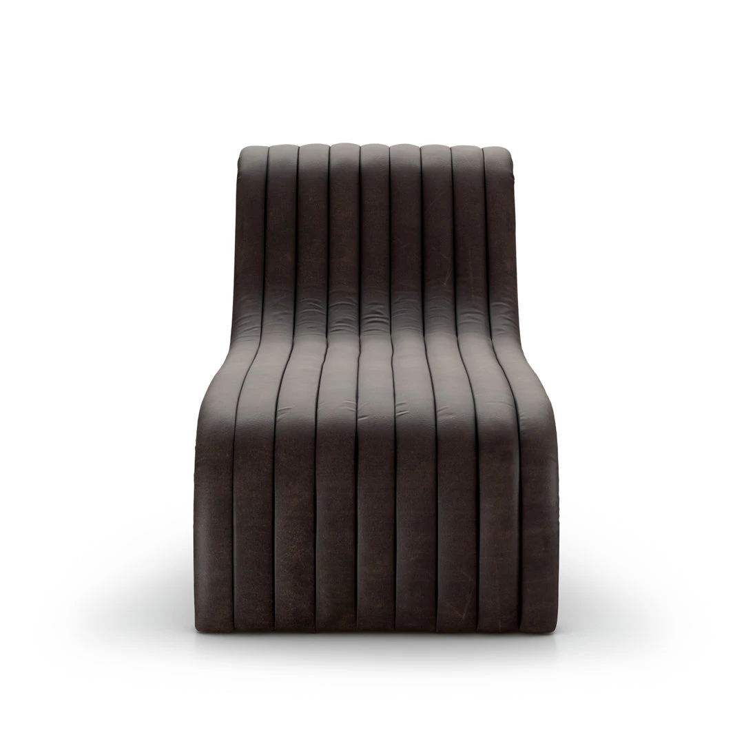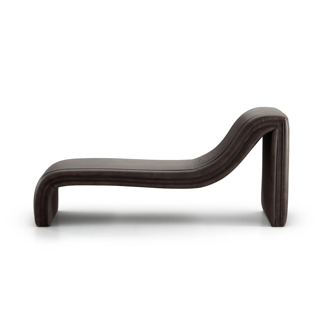 The Augustine Chaise Lounge in Deacon Wolf from Four Hands features a modern take on the classic chaise. Top-grain leather adopts dramatic linear channeling for texture and comfort alike. This luxurious piece infuses comfort and style into a variety of spaces such as bedrooms, offices, and entryways.