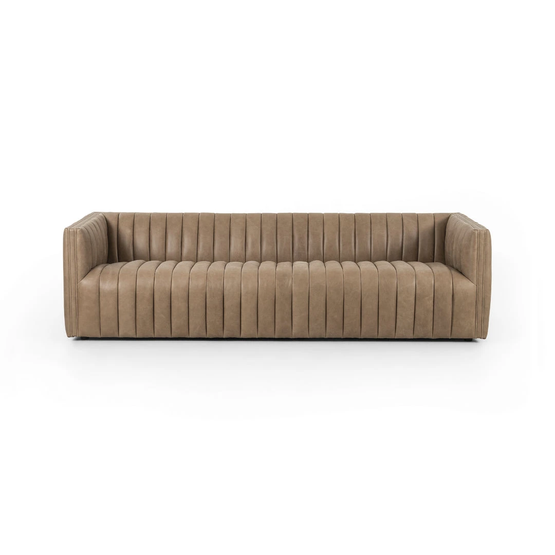 The Augustine Sofa in Palermo Drift Leather from Four Hands features dramatic channeling and deep tufting delivering generous depth to curvy, expertly-upholstered seating styles. The angular shape is the perfect complement to modern and contemporary decor schemes.