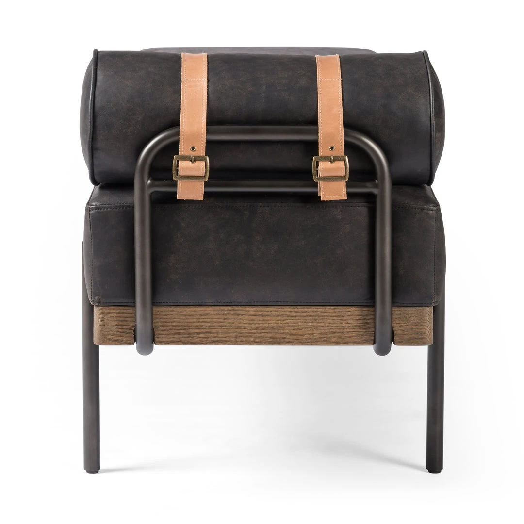 The Giorgio Accent Bench in Rialto Ebony from Four Hands features leather upholstery that lends a high-end look to bench-style seating ideal in the entryway, living space or foot of the bed. Secured by top-grain leather buckle straps, a removable bolster can be positioned on either end of bench with ease. A honey-finished oak base and black iron framing finish things off for a sleek material mix.