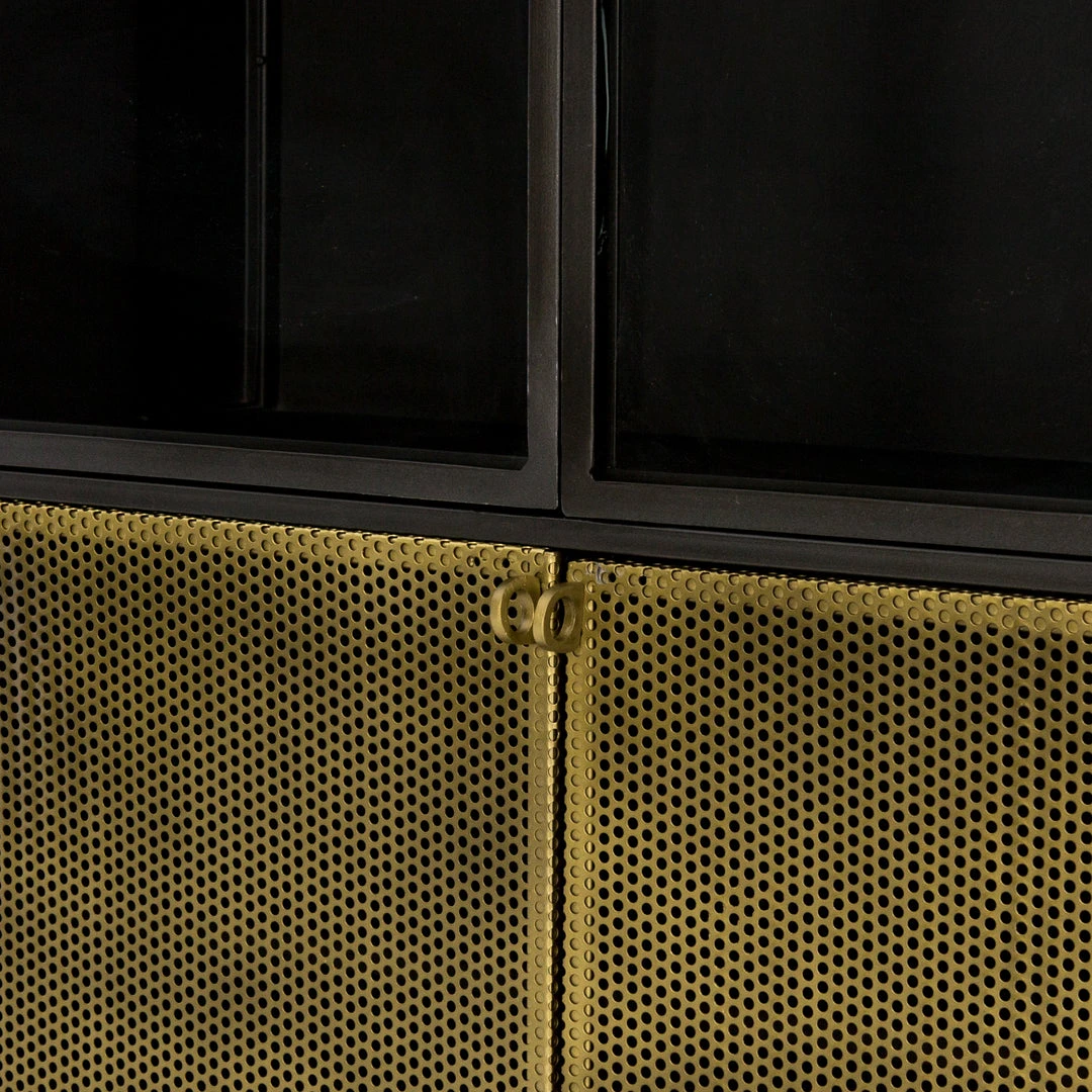 The Hendrick Cabinet from Four Hands offers a textural take on streamlined shaping. The Hendrick highlights Mid Century form and translates a modern refresh via unique materials. Angular iron framing welcomes drawer fronts and cabinetry of perforated brass, as ring style hardware adds a unique finishing touch. Cabinets like he Hendrick are ideally placed in the living room, master suite, or home office.