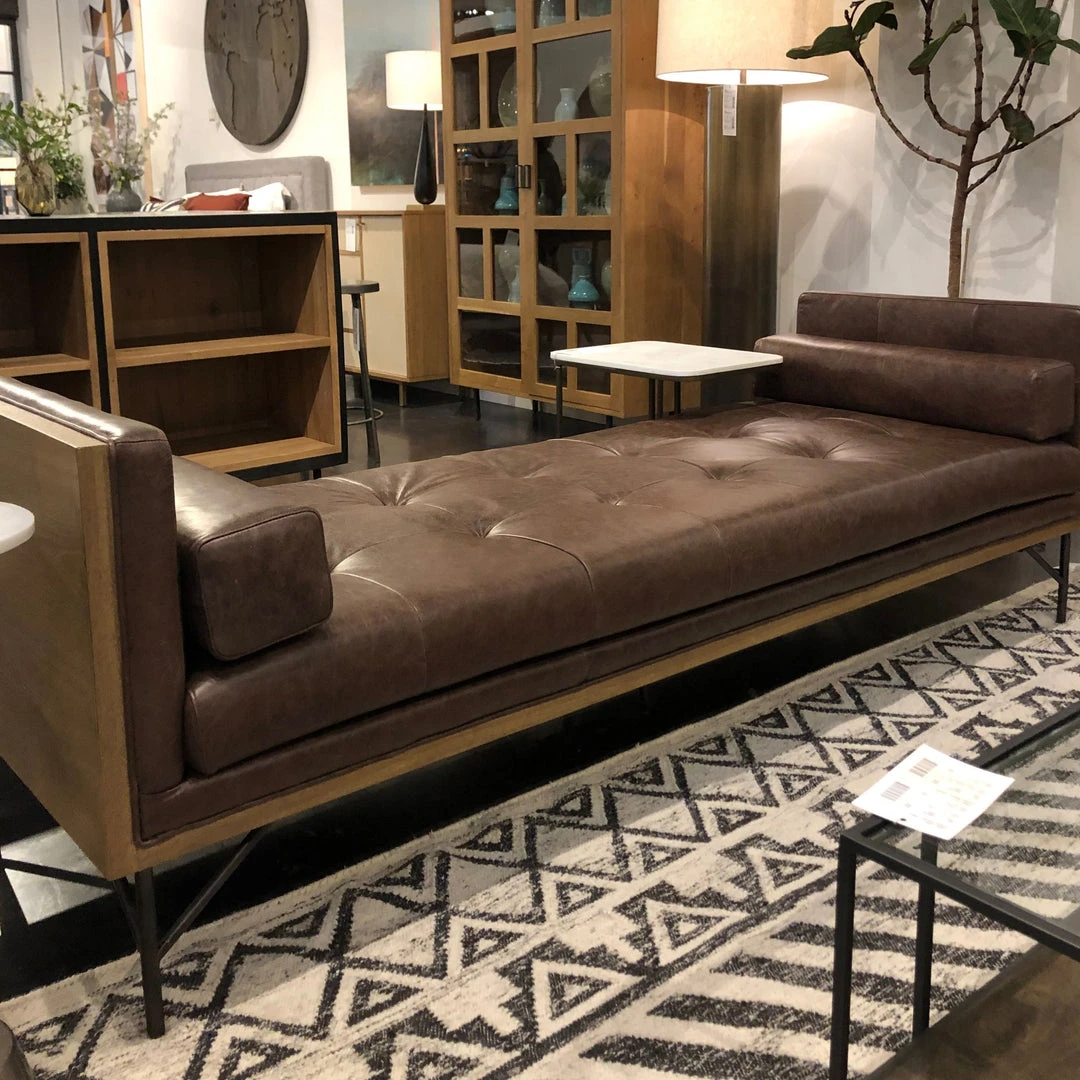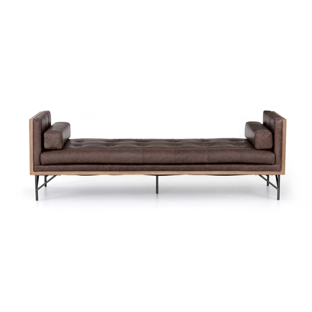 Four Hands showcases the Holden Chaise in Sonoma Coco delivering mid-century swank modernized by mixed materials. Toasted ash casing contains exclusive top-grain leather, cocoa in color and lightly tufted for comfort. Oxidized iron legs and lumbar pillows offer a forward-thinking finishing touch. Place the Holden in living spaces, bedrooms and entryways for stylish design and comfort.