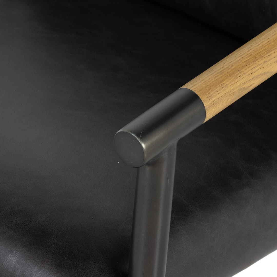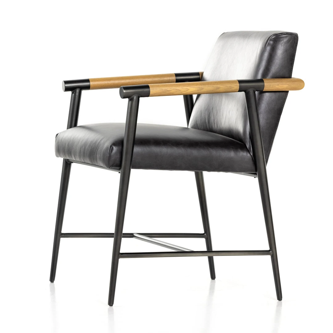 The Rowen Dining Chair in Sonoma Black from Four Hands features buttery black seating of top-grain leather, with angular arms of exposed oak for fresh contrast. Slim, black-finished stainless steel legs add a dose of modern-industrial edge.