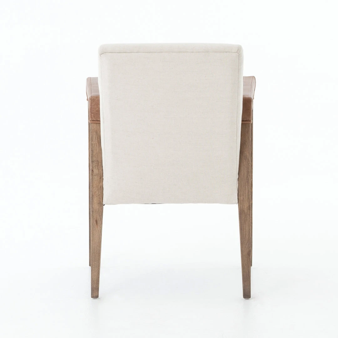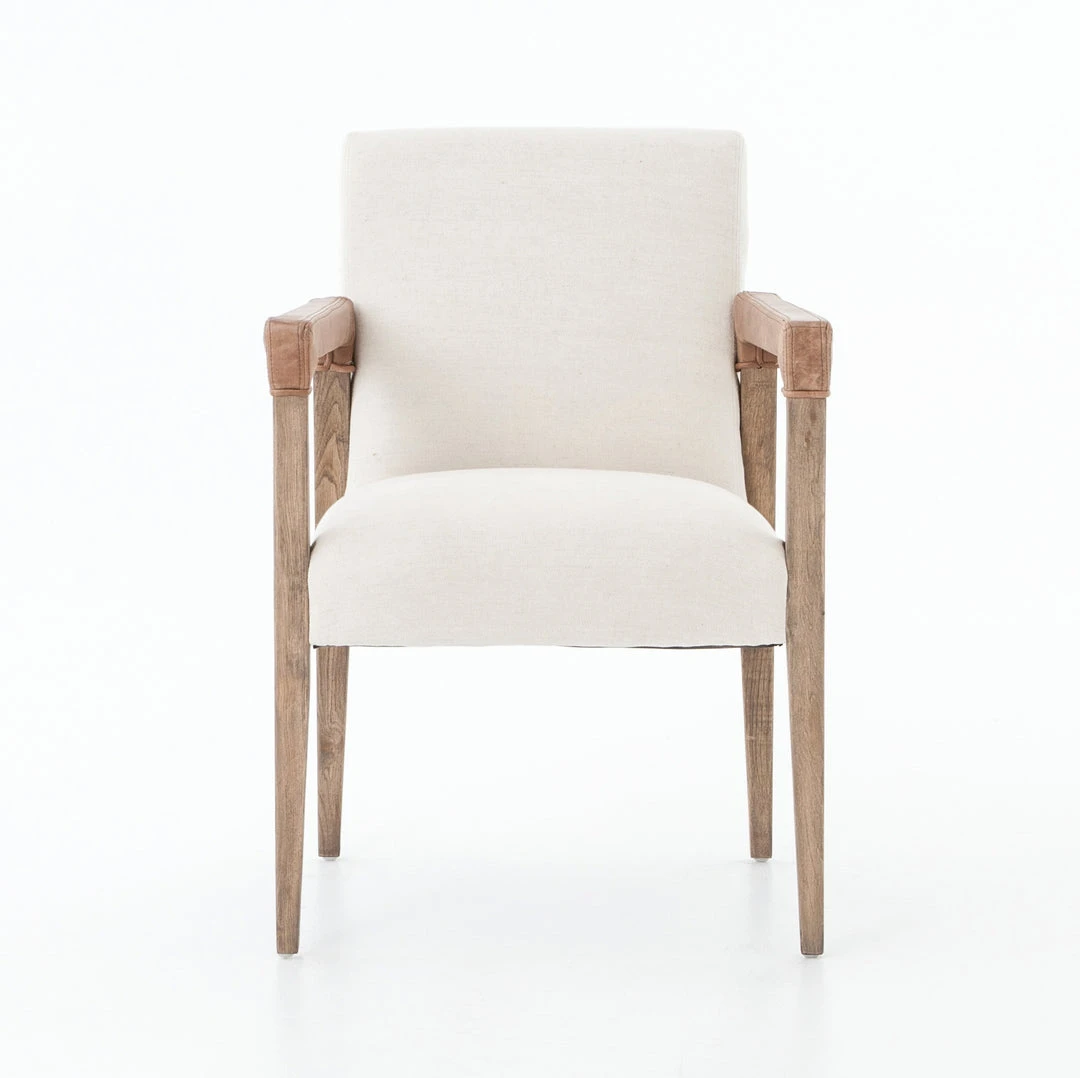 Four Hands presents the Reuben Dining Chair, capturing easy elegance for your dining room. Slim, tapered oak with arms wrapped in vintage leather support a floating seat covered in natural linen. The Reuben is ideal for dining rooms, breakfast nooks and kitchens.