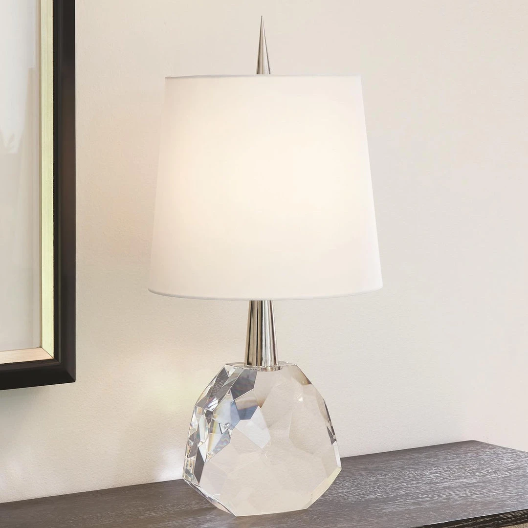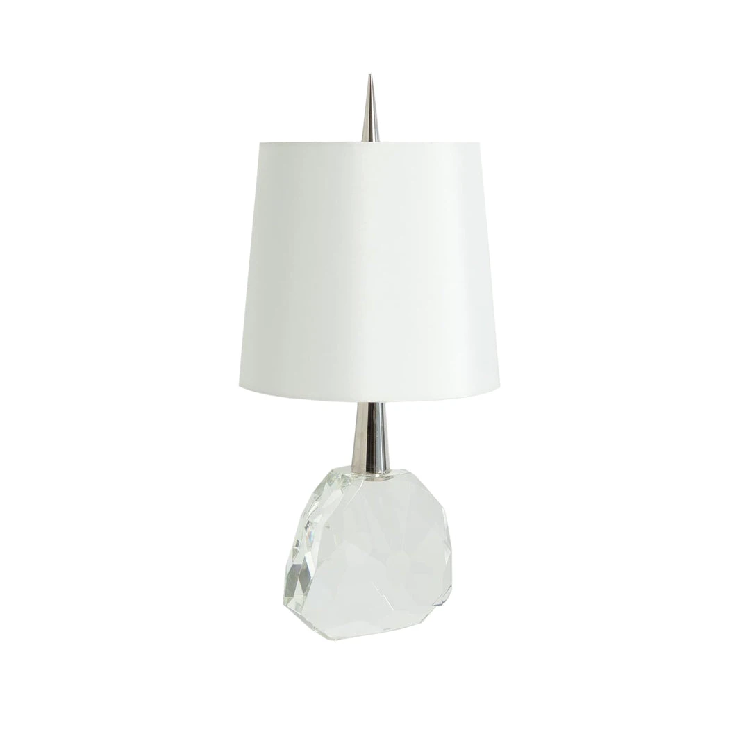 The Global Views Gem Table Lamp can be used to spike your décor with this jewel of a lamp designed by Julia Buckingham! The contemporary table lamp features an elegant, clear crystal faceted base, the tall table lamp is showcased on a polished nickel spike that leads up to a beautiful silk shade. Perfect as table lamps for living rooms or bedroom table lamps!.