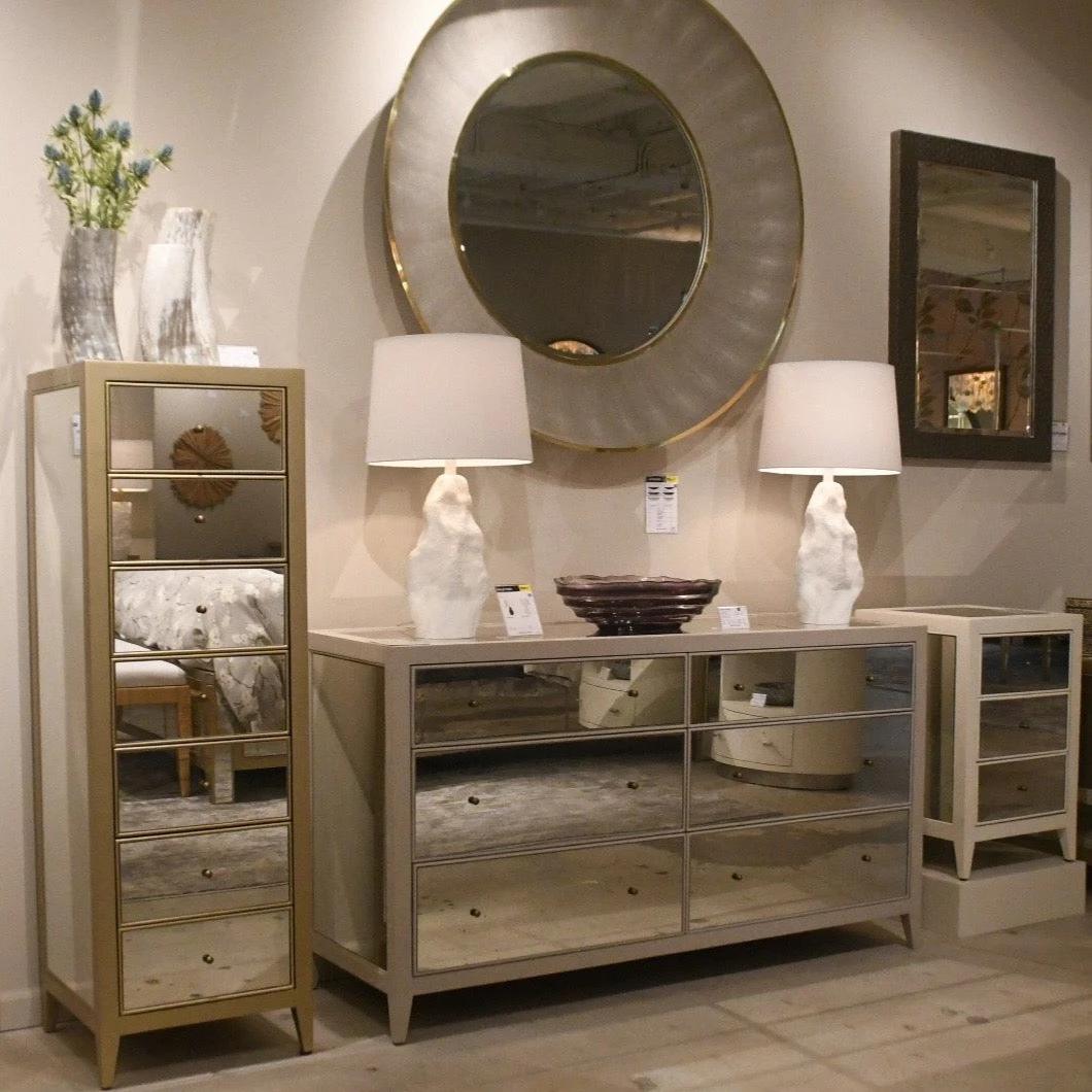 | Materials | Sand Faux Shagreen; Beveled Mirror; Brass Accents |