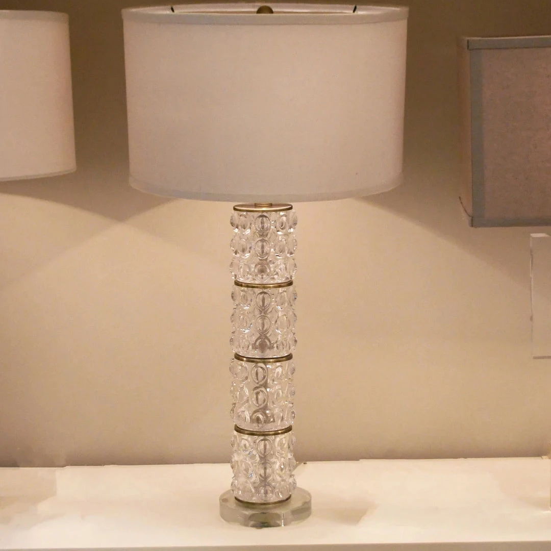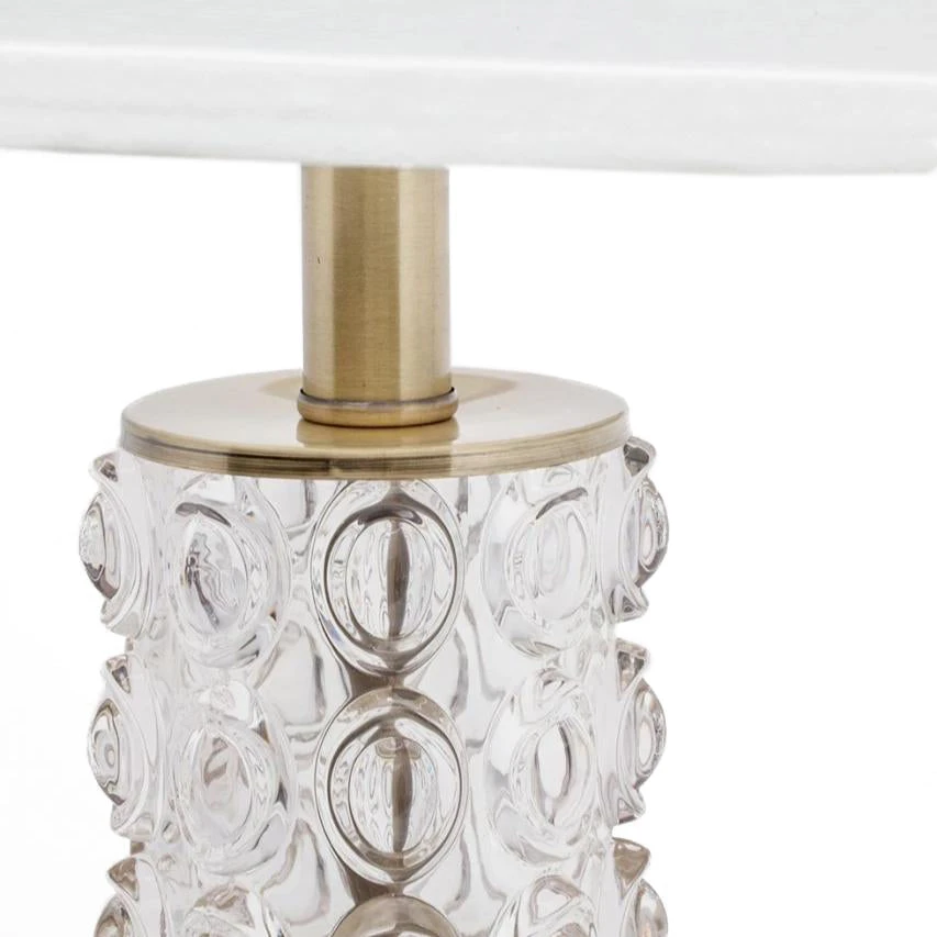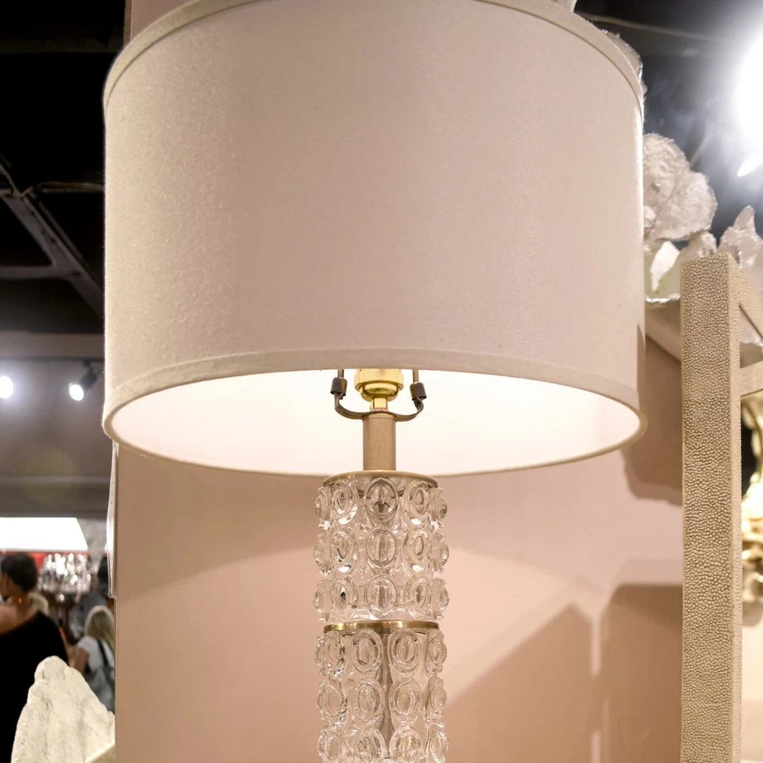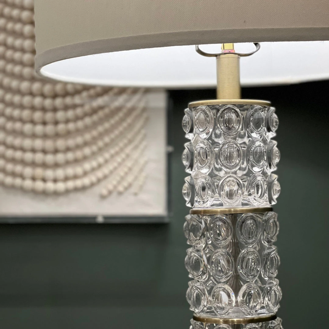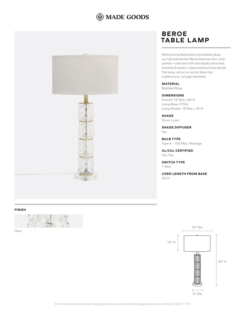 Made Goods Beroe Table Lamp in Clear Bubbled Glass takes refined luxe to a new level. Tall table lamps like the round Beroe give you a modern yet vintage aesthetic to brighten your space. This glass table lamp reflects brass band accents, an acrylic base, and neutral and organic linen drum shade. Consider using the Beroe as table lamps for your living room or as bedside table lamps.