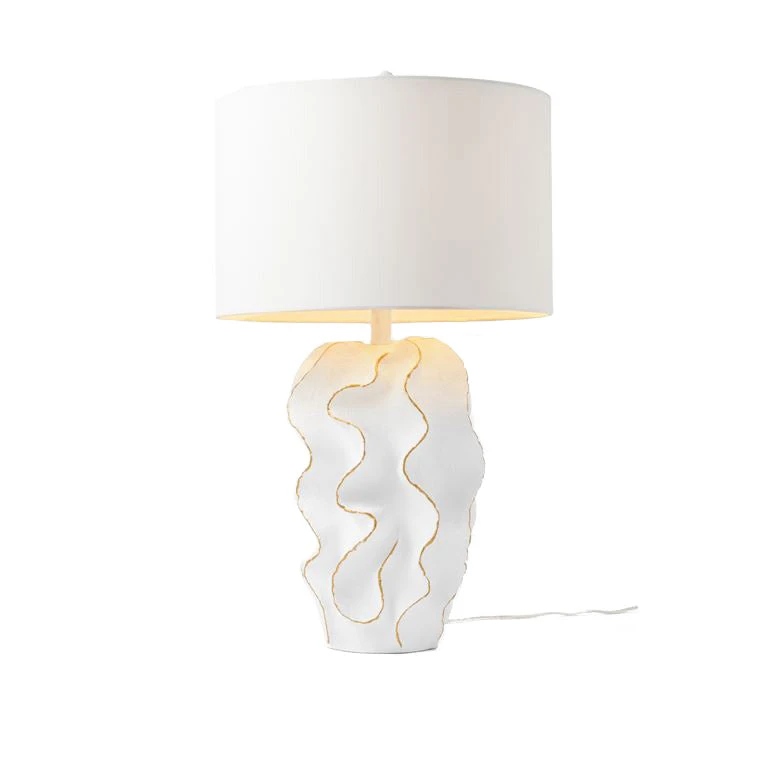 The Betanny Lamp in White with Gold features undulating curves of mold-cast textured white resin that soften the shape of this traditional urn lamp base. Topped with a and elegant linen shade and detailed with gold touches, the Bethany is the ideal lamp for bedrooms and living spaces alike.