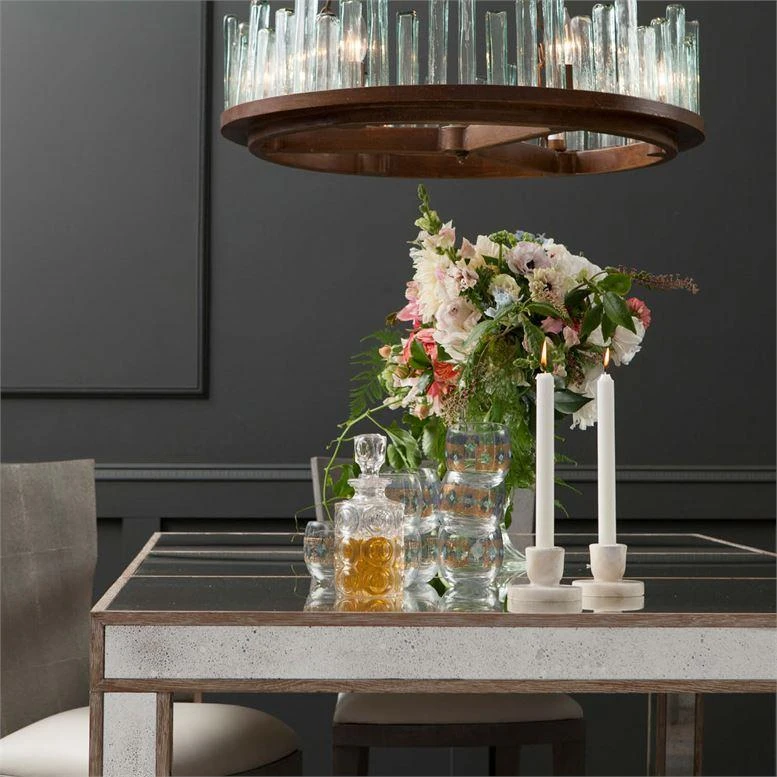 Made Goods Brando Chandelier in Glass and Bronze Metal consists of a round frame, supporting glass tubes in varying heights. This modern chandelier lighting with its faintly soft shade of blue glass provides a warm, intimate vibe in your home. Use the contemporary six light Brando over your dining table to create a casual yet elegant ambiance in your dining room. We also see the Brando used as a foyer chandelier, bedroom chandelier or living room chandelier.