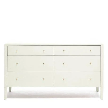 Made Goods Conrad 60″ Dresser in Pristine white is finished in a classic faux raffia resin. This oversized spacious six drawer cabinet for your home is designed as a rectangle with squared corners, gold drawer pulls, and tapered legs. Offering a perfectly scaled, modern contemporary style for bedrooms, dining rooms or offices, the extra large Conrad provides a variety of storage solutions in any room of your home. *This item is handcrafted and may show slight variation in size from one piece to another.