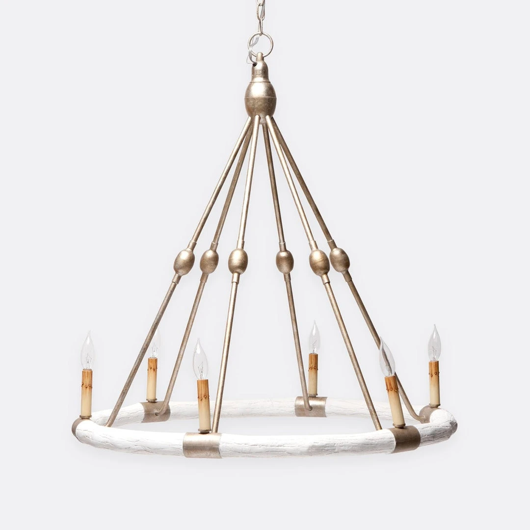 The Dean Chandelier in White and Silver from Made Goods features a faux bois circle that is the support for six chandelier lights anchored to a natural iron base. Iron also creates decorative support. The Dean Chandelier is a classic light and makes a statement in entryways, bedrooms, and offices alike.