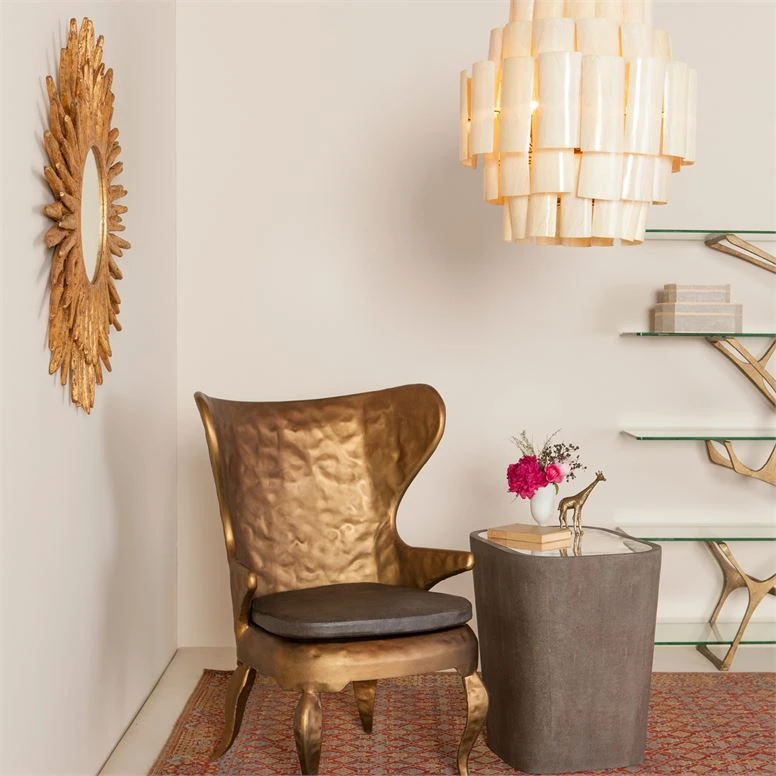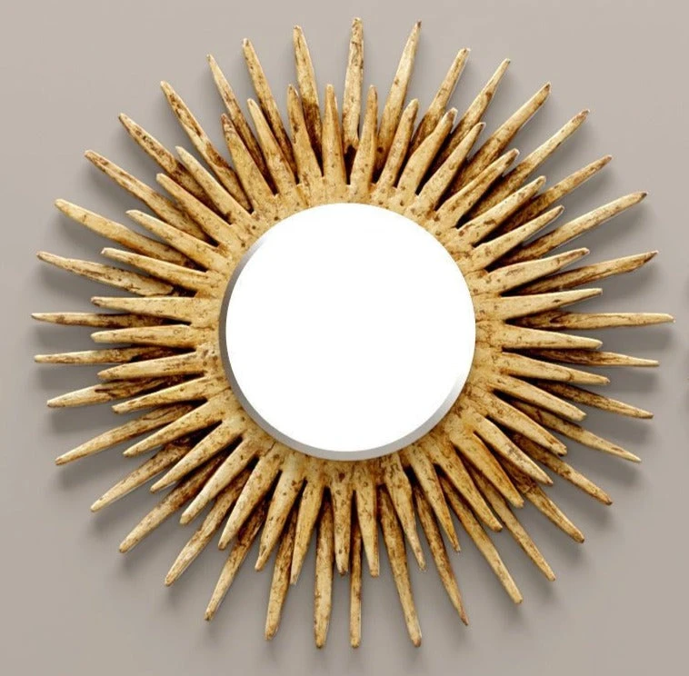 Made Goods presents the Donatello Mirror in Gold distressed teak wood. Imagine this glamorous round wall mirror in your entry, making a luxe statement as you, friends and family enter. Attention to detail makes this beveled edge mirror a natural focal point in any room of your home or office. We see this timeless sunburst design also beautifully displayed throughout your home as dining room mirrors, living room mirrors, bedroom mirrors, or office mirrors. *As seen in Elle Decor magazine.