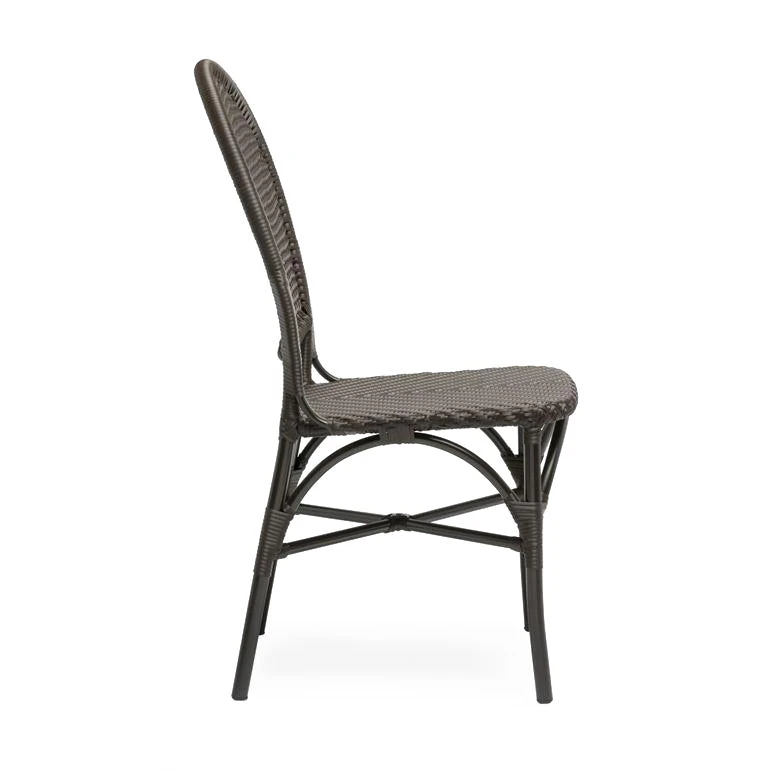 The Made Goods Donovan Side Chair in brown features gracious curves that round out this modern side chair. Expert construction, perfect pitch, and a woven seat and back offer a French Bistro style, making this brown seating the perfect accent when used as a living room side chair or dining room side chair. Suitable as outdoor seating.