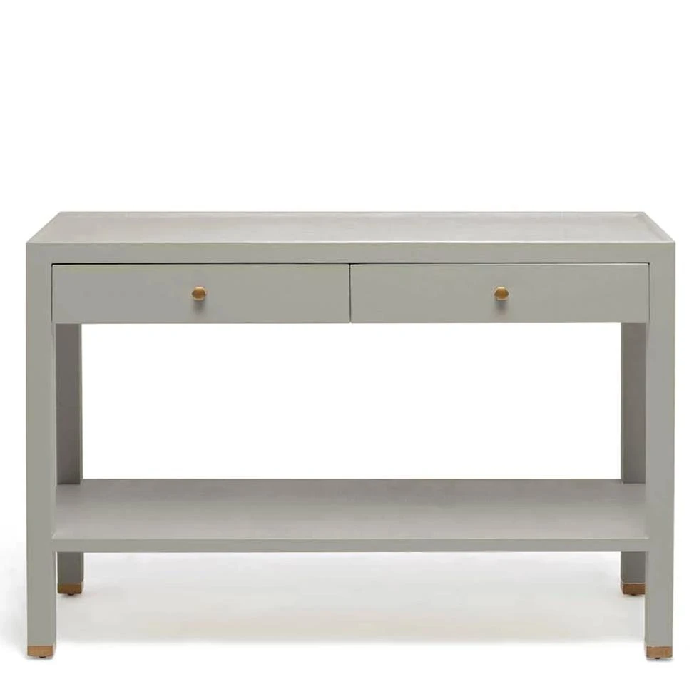 The Jarin Console from Made Goods in light gray faux belgian linen features a traditional shape with a subtle lip top. The two drawer storage is fabulous for keeping things organized. The open bottom shelf can be left as is or used to display objects of interest. From Made Goods, the Jarin collection is a sophisticated and clean looking line that works well with all decor styles.