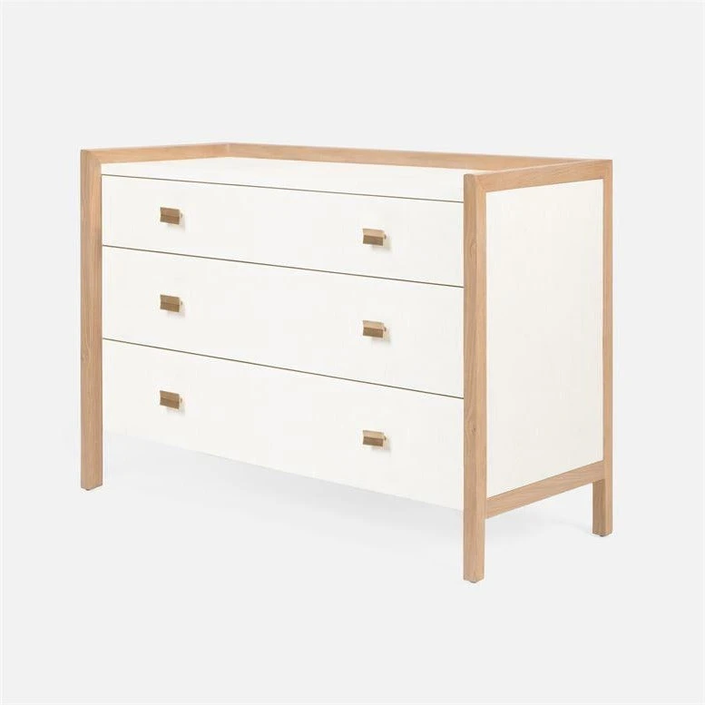 Made Goods Kennedy 48″ Dresser Pristine and Light Bleached Oak showcases a faux shagreen texture and is framed by a raised veneer border. This retro dresser features three self-closing drawers for the ultimate in storage versatility. Extra-large dressers like the Kennedy can also be placed in living spaces throughout your home. Consider using it as a dining room buffet or for storage in the home office.
