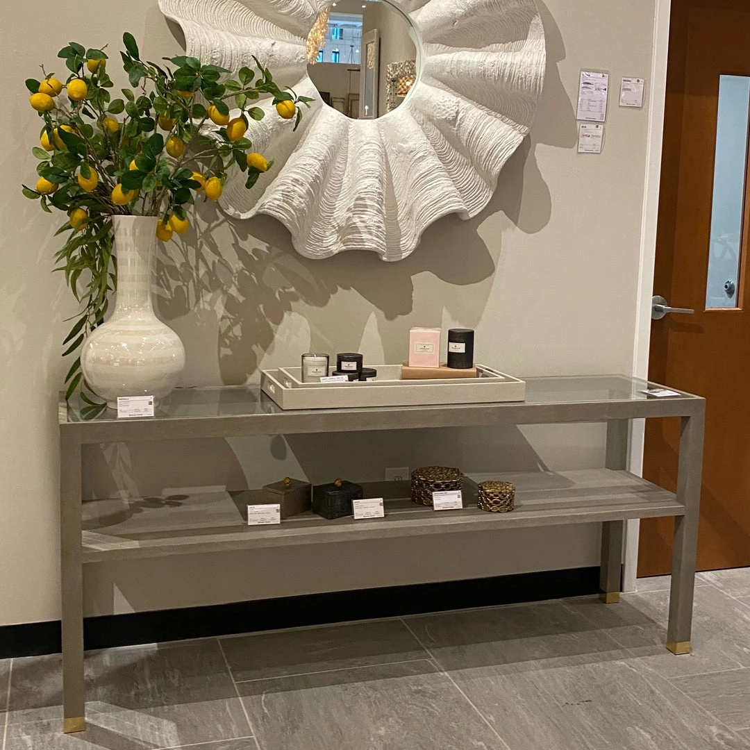 The Lafeu Console in Sand Realistic Faux Shagreen from Made Goods features a simple, square frame fully finished in luxurious faux shagreen. A glass top reveals the piece’s lower shelf, and the table’s feet are capped in brass for a chic finishing detail. The Lafeu is the perfect piece for entryways, living spaces and office environments alike.