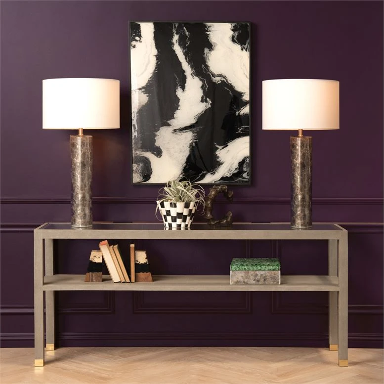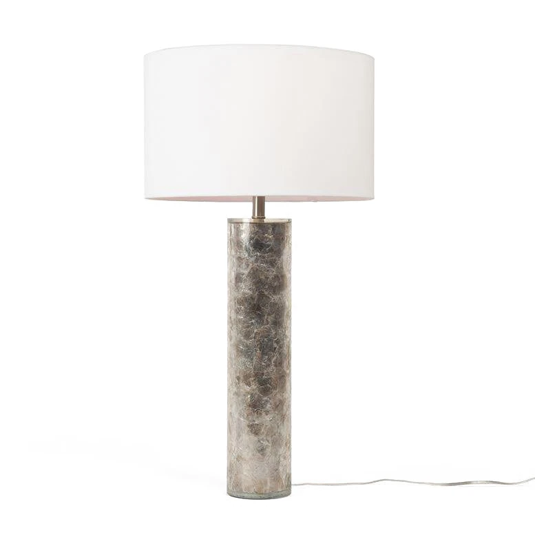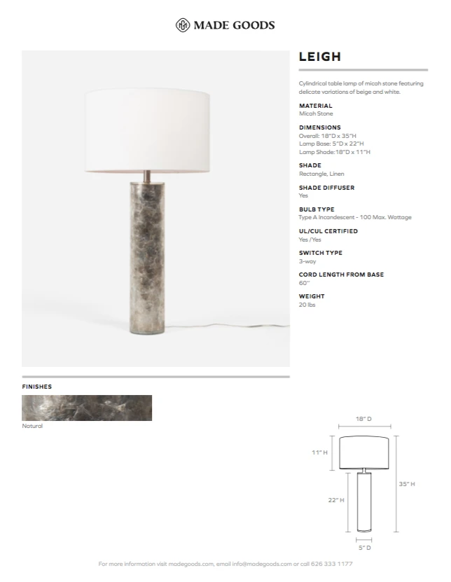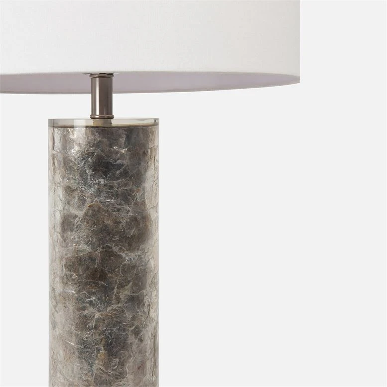 The Leigh Table Lamp from Made Goods features a round column covered in a unique and luxurious Micah stone with delicate variations of beige and white. Topped with a linen rectangle off white shade, the Leigh offers a high-end designer look for any room of your home.