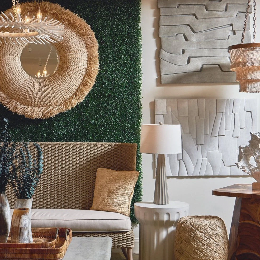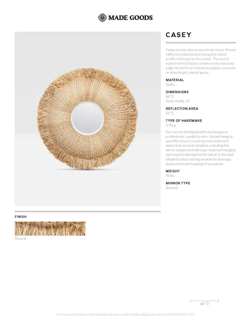 The Casey Mirror from Made Goods features a round frame of braided woven organic raffia that expands from the center. Each braid is tufted to form an outer edge of texture on this large reflective wall accessory. Unique mirrors like the Casey Mirror from Made Goods are ideal for your sunroom, living room, or dining room. We also see oversized wall mirrors like the Casey making a chic statement when used as vanity mirrors. * As seen in Atlanta Homes Magazine.
