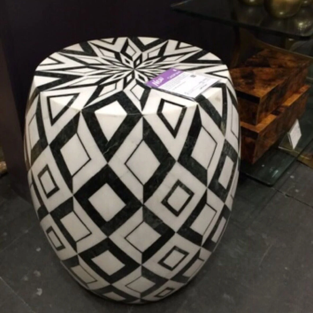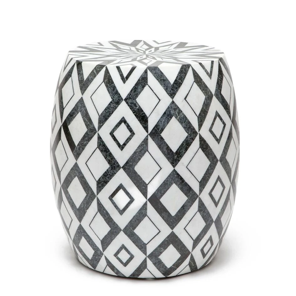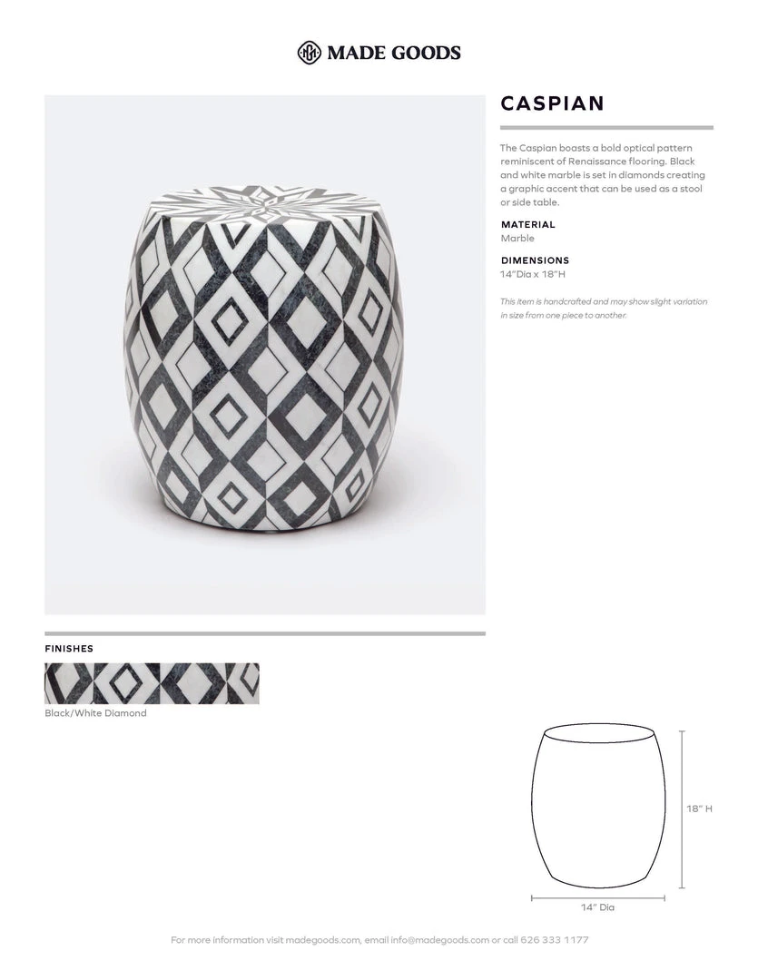 Made Goods Caspian Stool in Black and White marble showcases a classic diamond design, perfect for a myriad of decor schemes. Round garden stools provide extra seating for your guests and can be tucked under a console when not in use. Offering function and style, the Caspian can be used as an outdoor garden stool or as a small side table for drinks and appetizers. Use this black garden stool in the living room, bedroom, sunroom or home office to add function and style. *As seen in HGTV magazine.