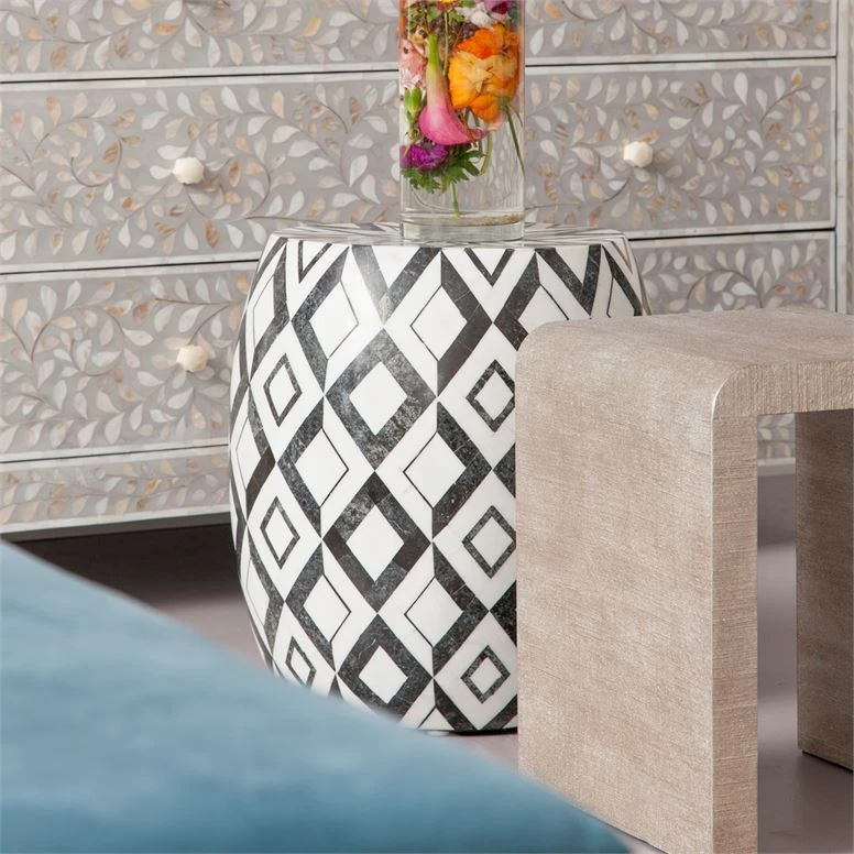 SKU: made-goods-7491308421 Categories: Brands, Furniture, Made Goods, Made Goods, New, New Arrivals, Seating, Stools Tags: Black and white garden stool, Geometric, Instock, Made goods furniture, Marble, Side tables, Small side tables, White and black