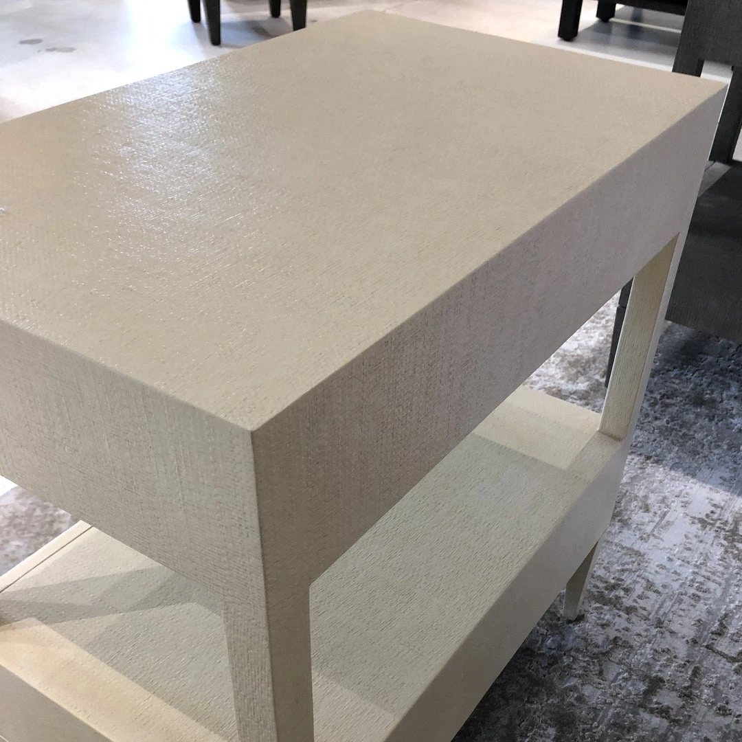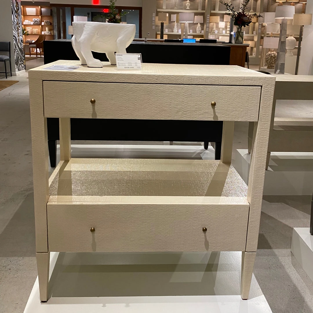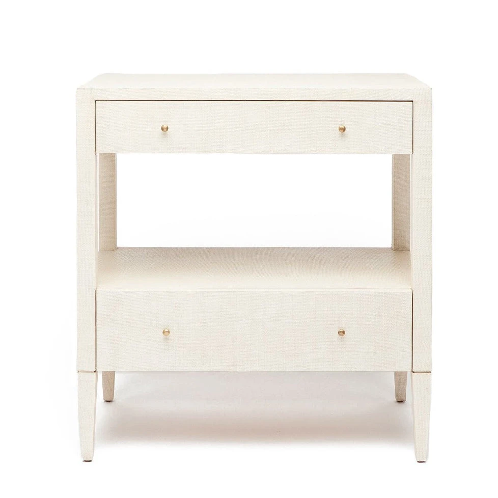 Made Goods offers the oversized Conrad Double Nightstand in Off-White raffia resin with a slight sheen. Clean lines, 2 drawers for storage, and an open shelf make this versatile side table a perfect addition to any sitting area of your home. Use as a living room side table, placing one on either end of your sofa or settee. Or, place this bed side table between two chairs in your master suite or office. Side tables like the Conrad give you practical function with sophisticated style. *This item is handcrafted and may show slight variation in size from one piece to another.