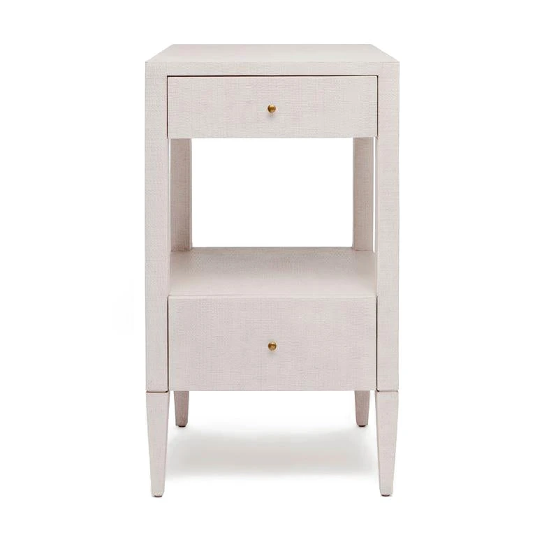 Made Goods Conrad Single Nightstand in French Gray faux raffia brings stylish sophistication and function to your home. Square side tables like the versatile Conrad provide storage and display surface for your lighting and decorative items. This modern contemporary design showcases clean lines, two storage drawers, brass knobs, an open shelf, and tapered legs. Ideally used in the bedroom, side tables like the Conrad could also be used as your sofa side table. *This item is handcrafted and may show slight variation in size from one piece to another.
