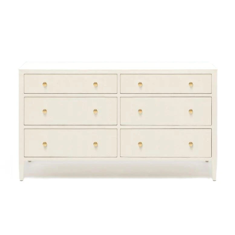 The Jarin 60″ Dresser from Made Goods features six drawers allowing for great storage. The angular piece is finished in faux Belgian Linen in a beautiful shade of white. The textured finish gives the furniture a stand-alone appeal. The designer has added simple brass knobs to complete the look of luxury.
