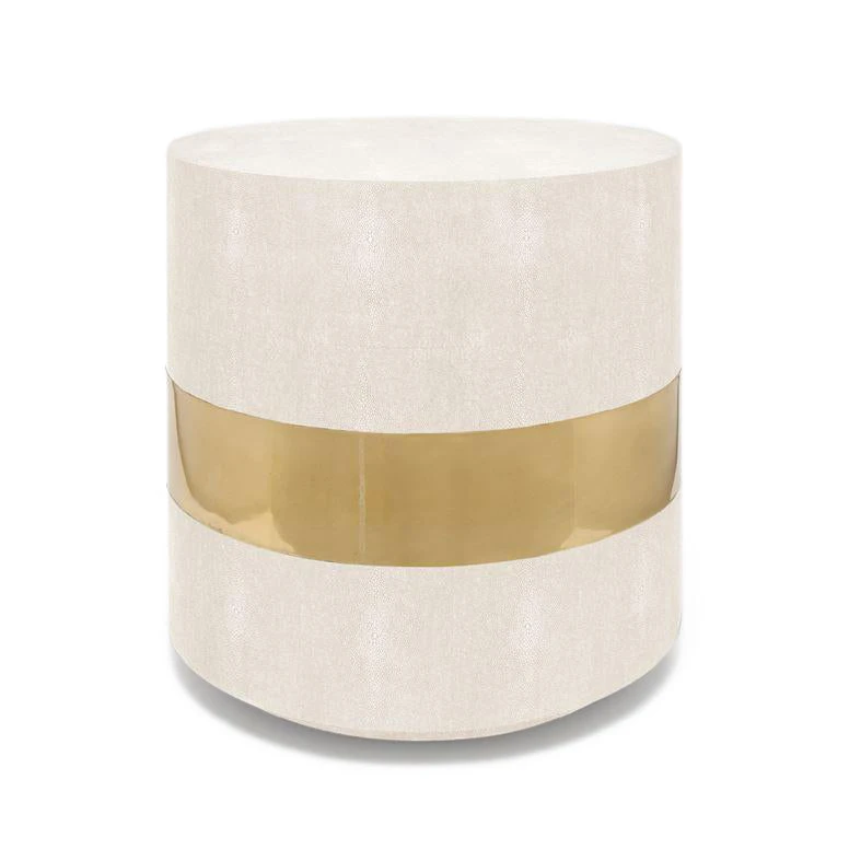 Made Goods introduces the round Maxine Side Table in Snow and Brass, featuring a modern texture of faux shagreen. Small side tables, with a modern vibe like the Maxine, work well with a myriad of decor styles. Accented with a wide band of polished brass, this white side table can be used in the living room or in other sitting areas of the home.