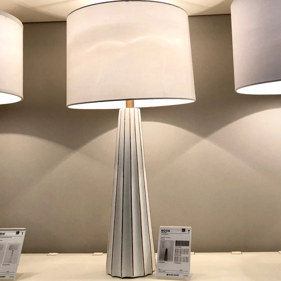 Made Goods Nova Table Lamp in White cement, accented with a subtle touch of gold leaf tipping, is topped with a lovely tapered linen drum shade. Table lamps like the Nova reflect sleek lines as seen in modern, contemporary lighting. Use this white table lamp as living room tables lamps or bed side table lamps. *Concrete material naturally distresses. Minor cracks and imperfections are to be expected.