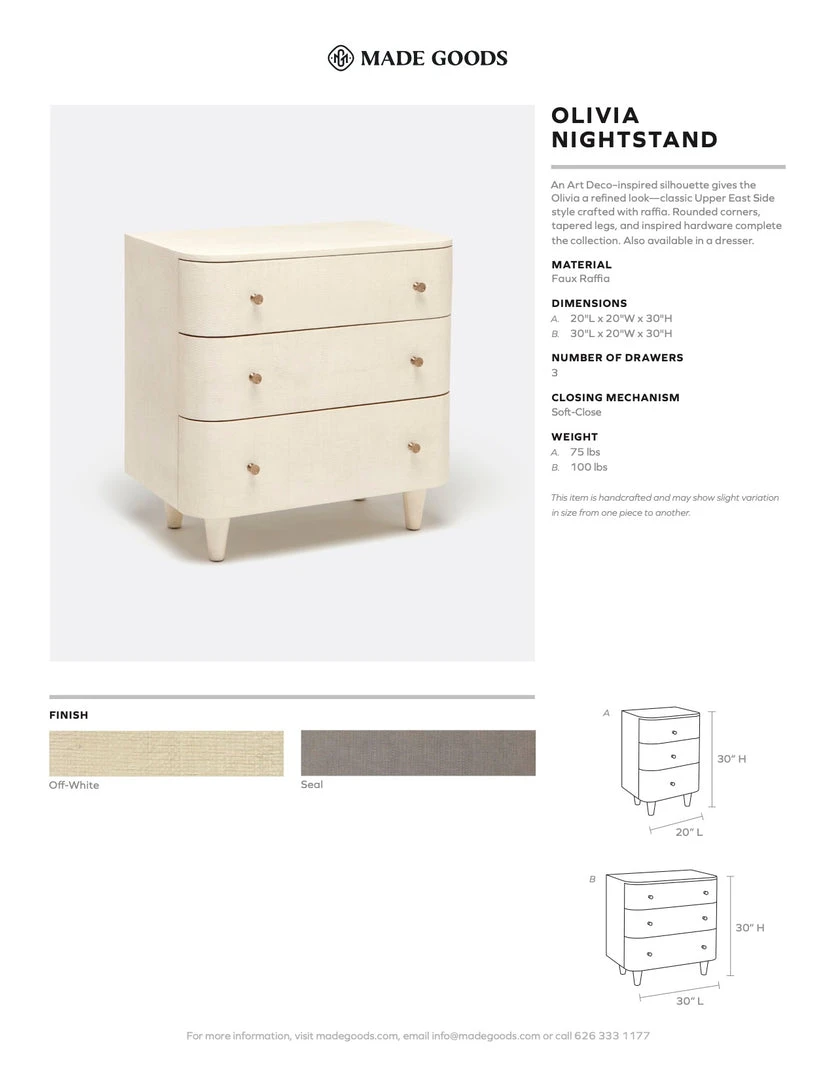 Made Goods showcases an Art Deco-inspired silhouette with the Olivia Double Nightstand in Seal Faux Raffia. This piece features a refined look with a nod to classic Upper East Side style. The Olivia is wrapped in faux raffia with rounded corners, tapered legs, and inspired brass hardware. Place the nightstand in bedrooms or consider this striking piece in the office or living room as a side table with functional and stylish storage options.