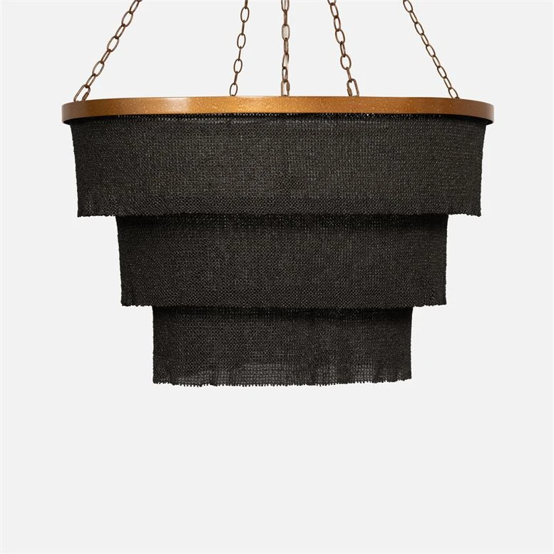The Patricia Oval Chandelier with Black Coco Beads and Gold from Made Goods is woven tightly into three overlapping concentric rings that move languidly in an oval profile. With a slight ruffle along the edge and flirtatious silhouette, the Patricia is pure glamour.