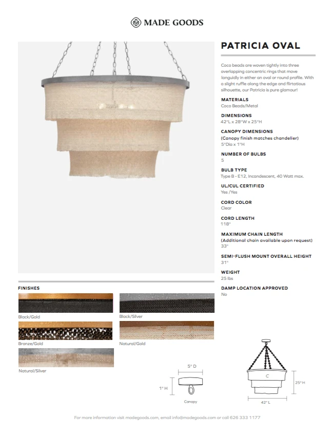 SKU: made-goods-6582710337584 Categories: Brands, Chandeliers, Chandeliers, Dining Room, Kitchen & Dining, Lighting, Made Goods, Made Goods, New, New Arrivals Tags: Black coco beads, Instock, Lighting, Made goods, Made Goods Chandeliers, May2021, Oval, Patricia