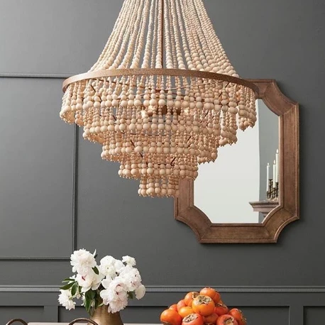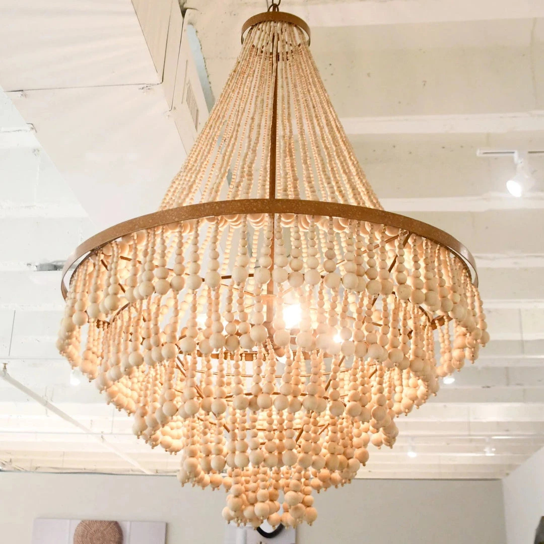 | Materials | Wood Beads; Metal; Natural Gold Finish; Three 40watt Type B Bulbs; Clear Cord |