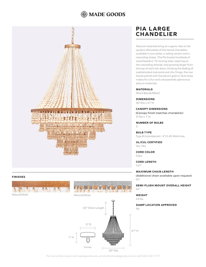 Made Goods Pia Large Chandelier in Natural Wood Beads features a wood bead chandelier with a 5 tier, gold frame. This chic hanging light showcases countless numbers of varying sized wood beads, giving this lighting an elegant, rustic vibe. Chandeliers like the Pia light work beautifully in any room of the home!