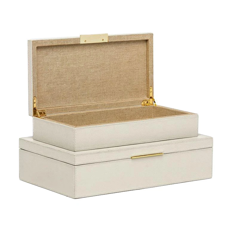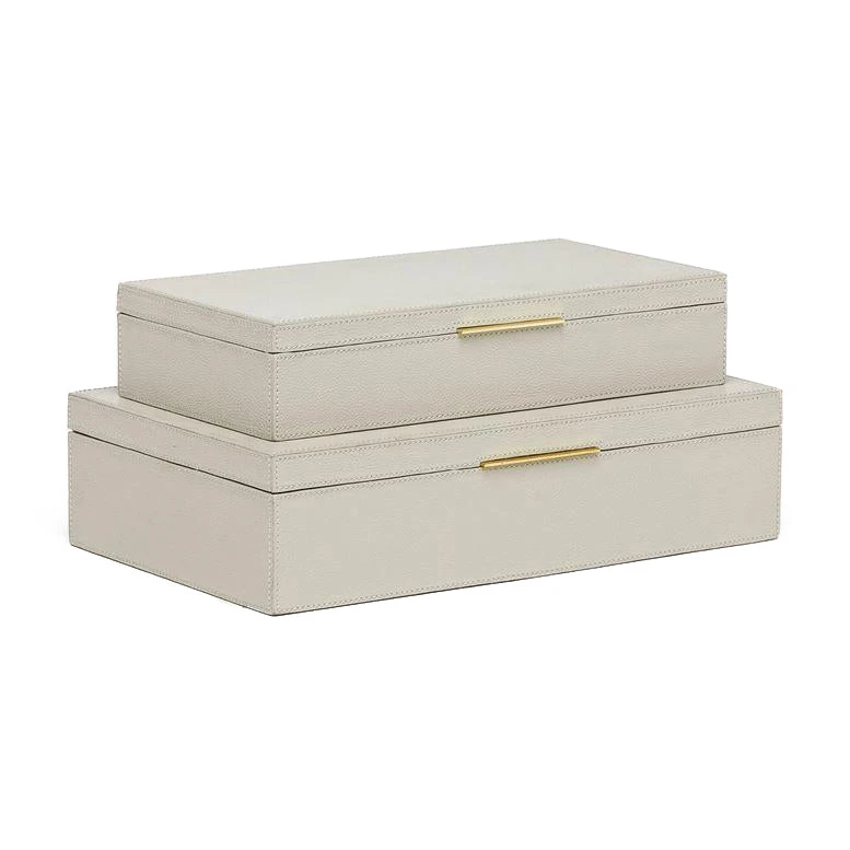 The Ralston Box Set in Light Gray Full Grain Leather from Made Goods showcases two convenient sizes for storing an assortment of your treasures. Crafted from full-grain leather and an elegant brass-lipped handle, these uniquely beautiful decorative boxes beg to be seen on your coffee table, bookshelf or console.