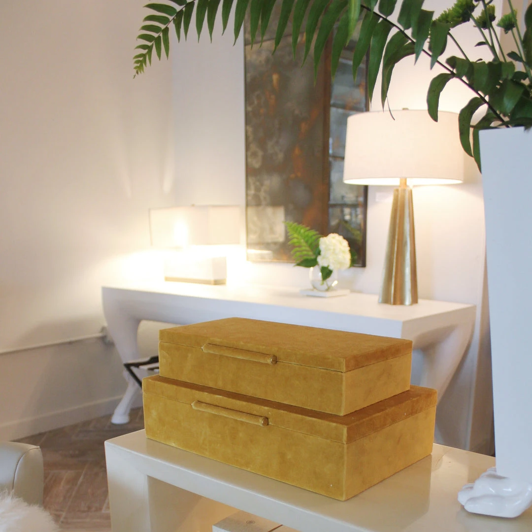 The luxurious Sinclaire Box Set in Ochre Velvet from Made Goods is ensconced in velvet inside and out with a sleek brass closure for a sophisticated detail. Place these elegant accessories on entryway consoles, desktops, or bookshelves for instant storage and chic style.