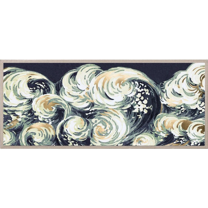The Natural Curiosities showcases the swell of the sea weightlessly folding and unfolding itself tumbles through this wide-format rendering. The Gold Leaf Wave from Natural Curiosities, a truly dynamic piece, was inspired by an image from a vintage textile reference book unearthed in northeastern France. The pronounced brushwork, striking contrast and sublime subject matter is definitive of the textile design revolution that took place in this region in the early-20th century. Deep, cold blues contrast markedly with the richness of the metallic gold in this powerful artwork, which is of unusually dramatic size perfect for crowning a wall.