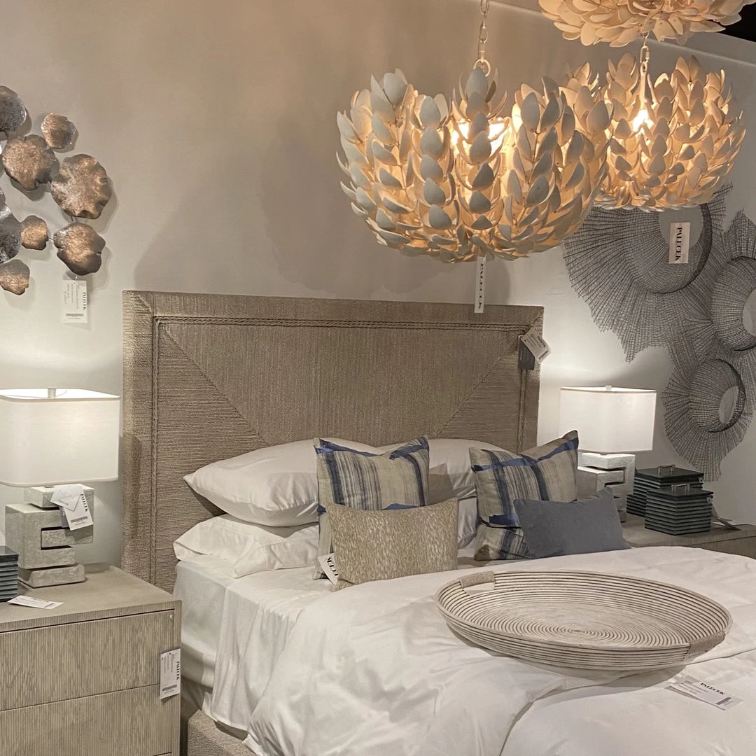 The Coco Magnolia Hanging Pendant from Palecek features hand-cut coco shells in petal forms in an off-white finish. Natural markings and indentations are part of the inherent beauty of coconut shells and add interest to the piece. Paired with an off-white finished chain and canopy hanging kit, this striking hanging light creates the perfect sophisticated coastal vibe. *Professional installation recommended.