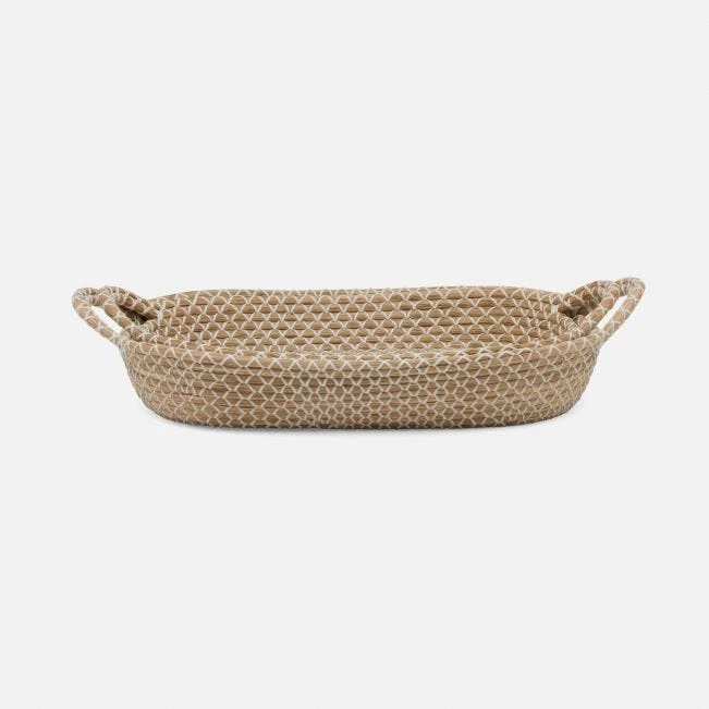 The Kendari Basket Set in Low from Pigeon and Poodle is handmade from coils of natural seagrass and crisscrossed strips of white seagrass. Consider using this versatile set to contain all your necessities in entryways, living spaces, and bedrooms alike.