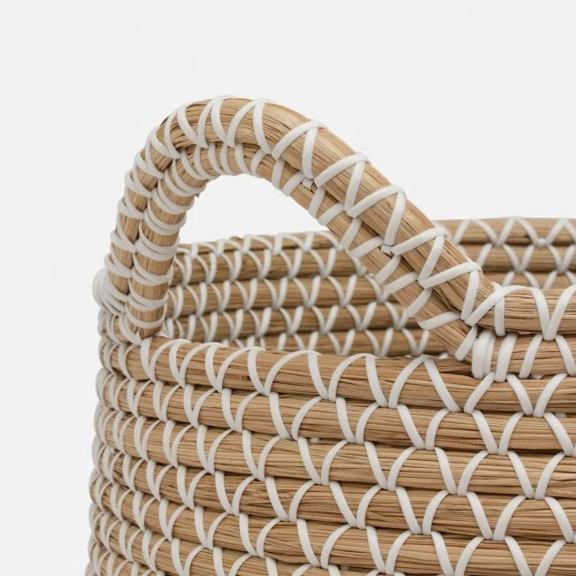 The Kendari Basket Set from Pigeon and Poodle is handmade from coils of natural seagrass and crisscrossed strips of white seagrass. Consider using this versatile set to contain blankets, pillows, toys, or extra bedding for storage in style.