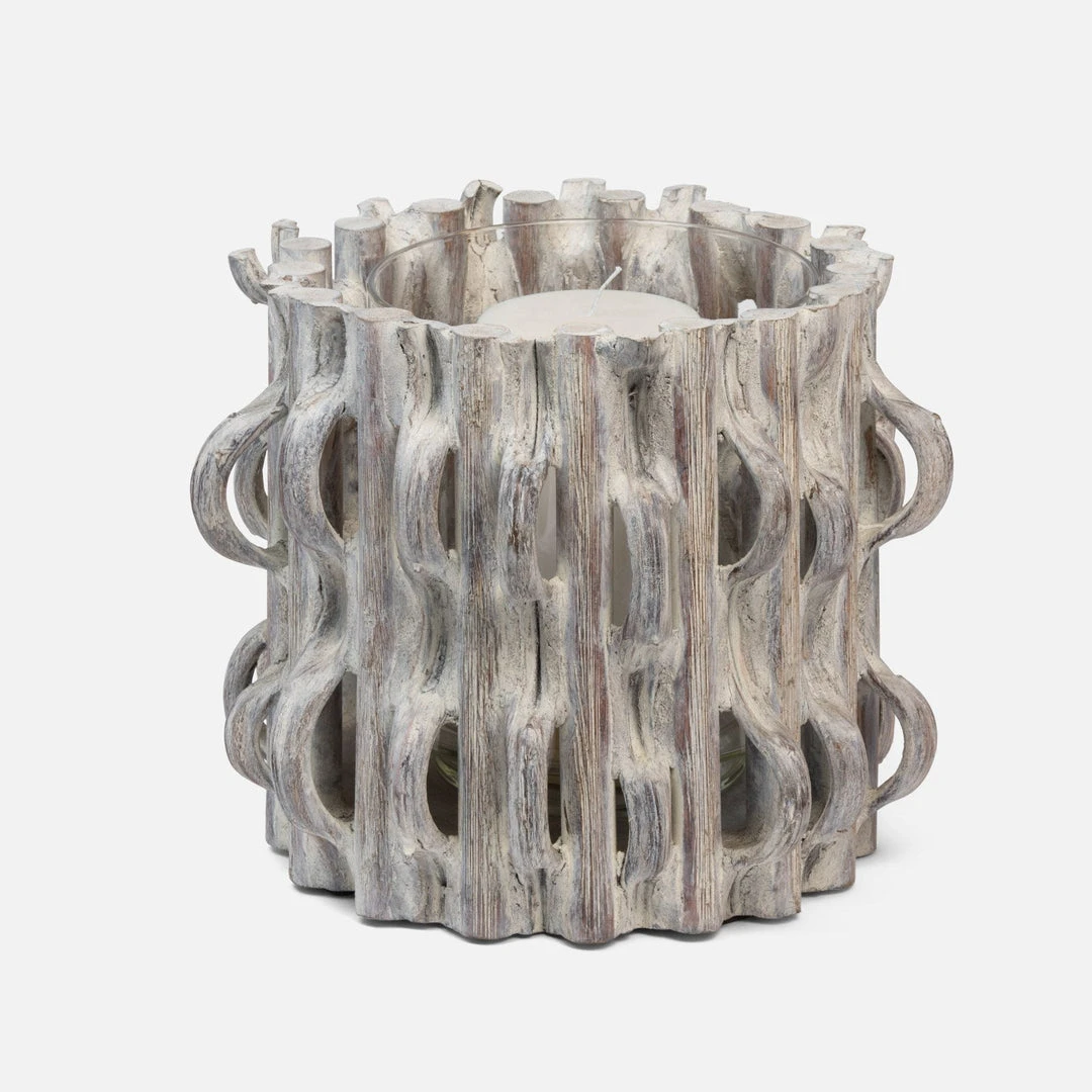 The Thurso Hurricane in Whitewashed Driftwood from Pigeon and Poodle is crafted from naturally wavy Liliana wood that is treated in a natural whitewash finish. The Large Thurso delivers the perfect hint of candlelight to your table surfaces *Glass insert included.