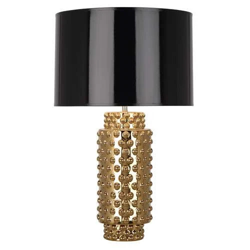 The Dolly Gold Table Lamp by Robert Abbey is crafted from ceramic with a gold metallic glaze and topped with a round, black opaque parchment shade lined in gold foil. Featuring a raised circle pattern across its body, the Dolly Gold Table Lamp adds texture and ambiance to your space that makes a statement from the entryway to the living room to the office.