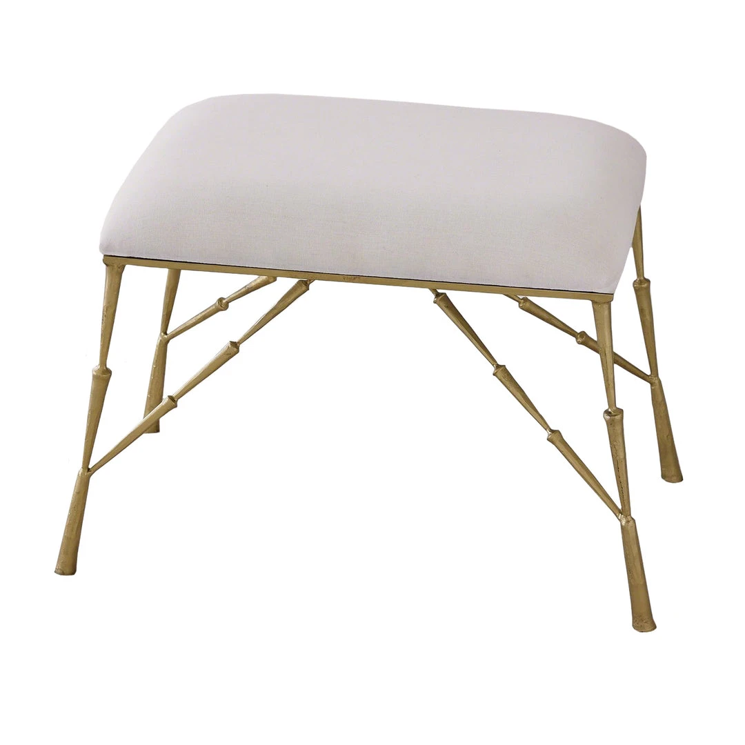 The Spike Small Bench in Antique Brass from Studio A is elegantly gold finished and features an attached plush cushion. Covered in muslin, this versatile bench allows you to slipcover or upholster this piece in the fabric of your choice. Use this elegant piece as a vanity bench or pair two together to slide under a console for an extra surface or for seating.