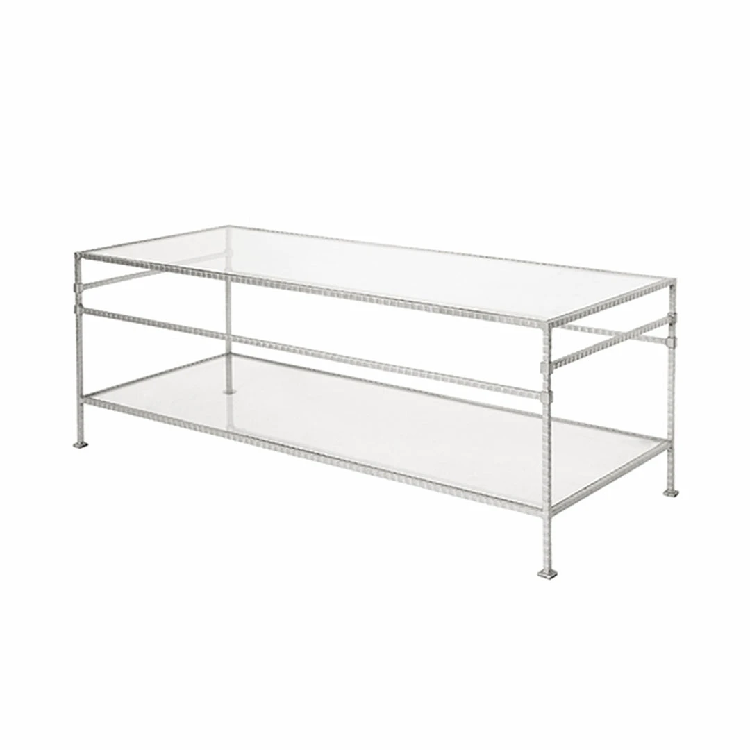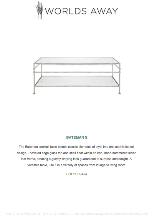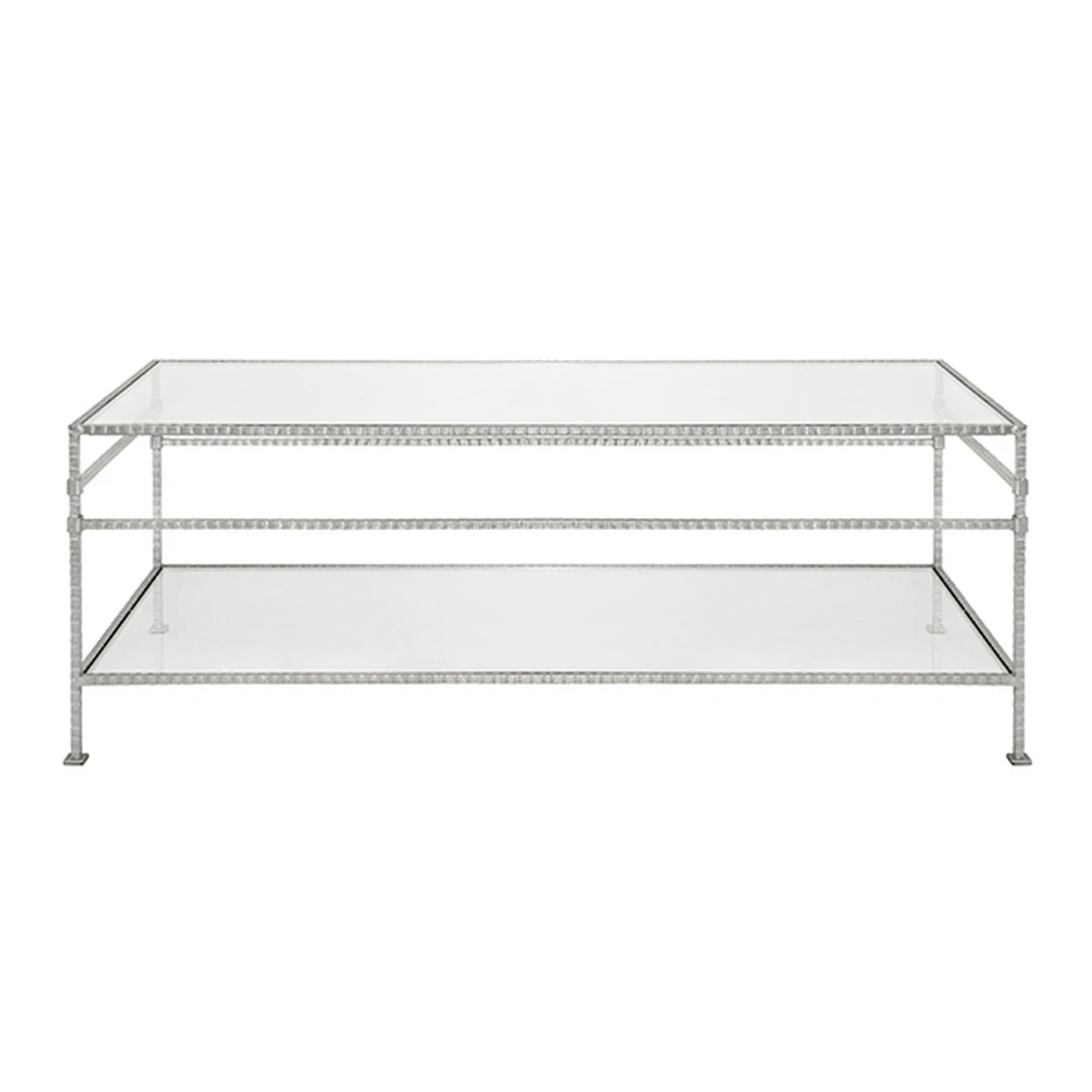 The Bateman Cocktail Table in Silver Leaf from Worlds Away blends classic elements of style into one sophisticated design. A beveled edge glass top and shelf float within an iron, hand-hammered silver leaf frame, creating a gravity-defying look guaranteed to surprise and delight. A versatile rectangle table, use it in a variety of spaces from the lounge to the living room.
