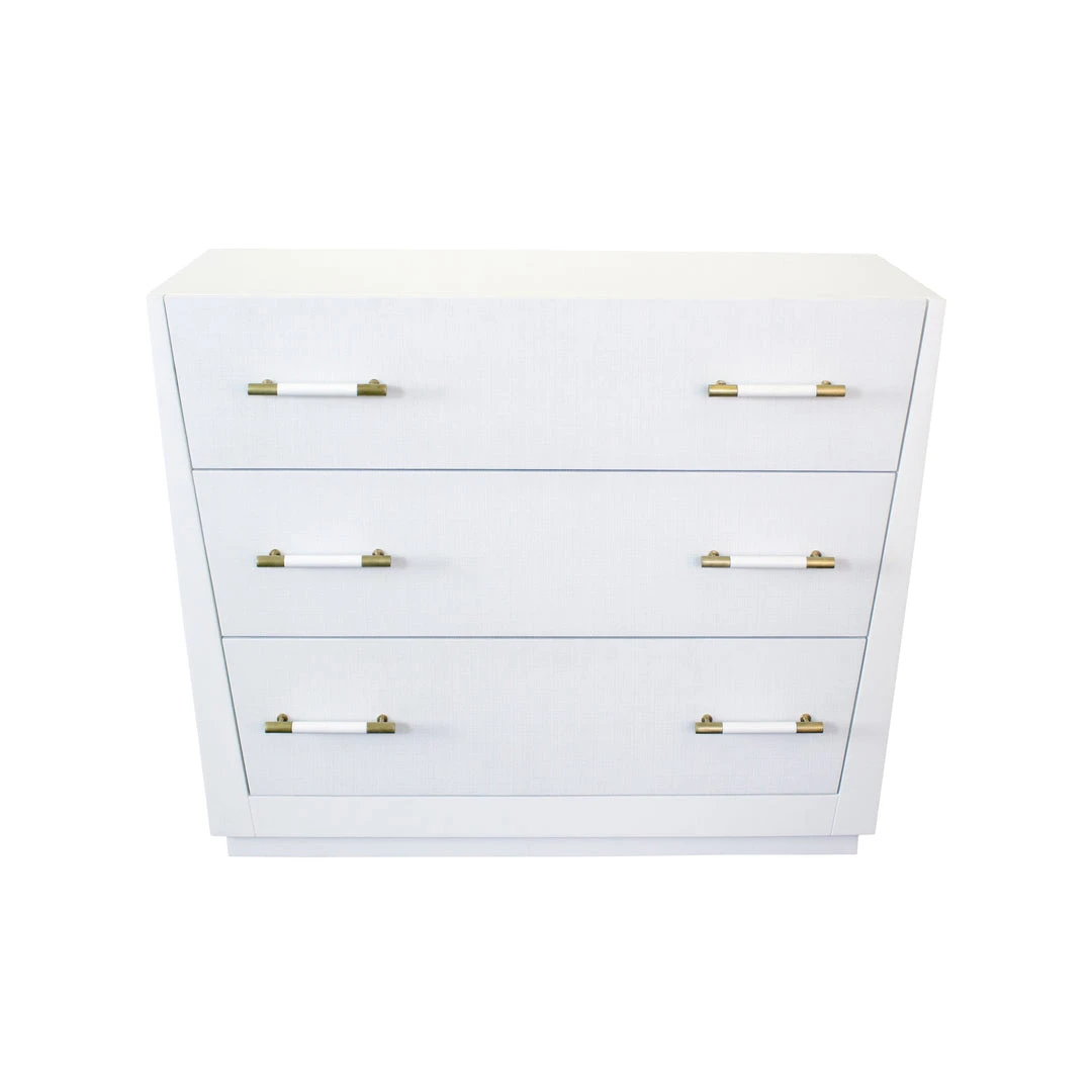 The Worlds Away Liam Chest in White Lacquer features a tapered design with a sleek white lacquer finish and 3 lacquered white linen drawers with brass hardware accents. The Liam delivers eye-catching modernity, making this versatile piece a must-have for bedrooms, offices and living spaces alike.
