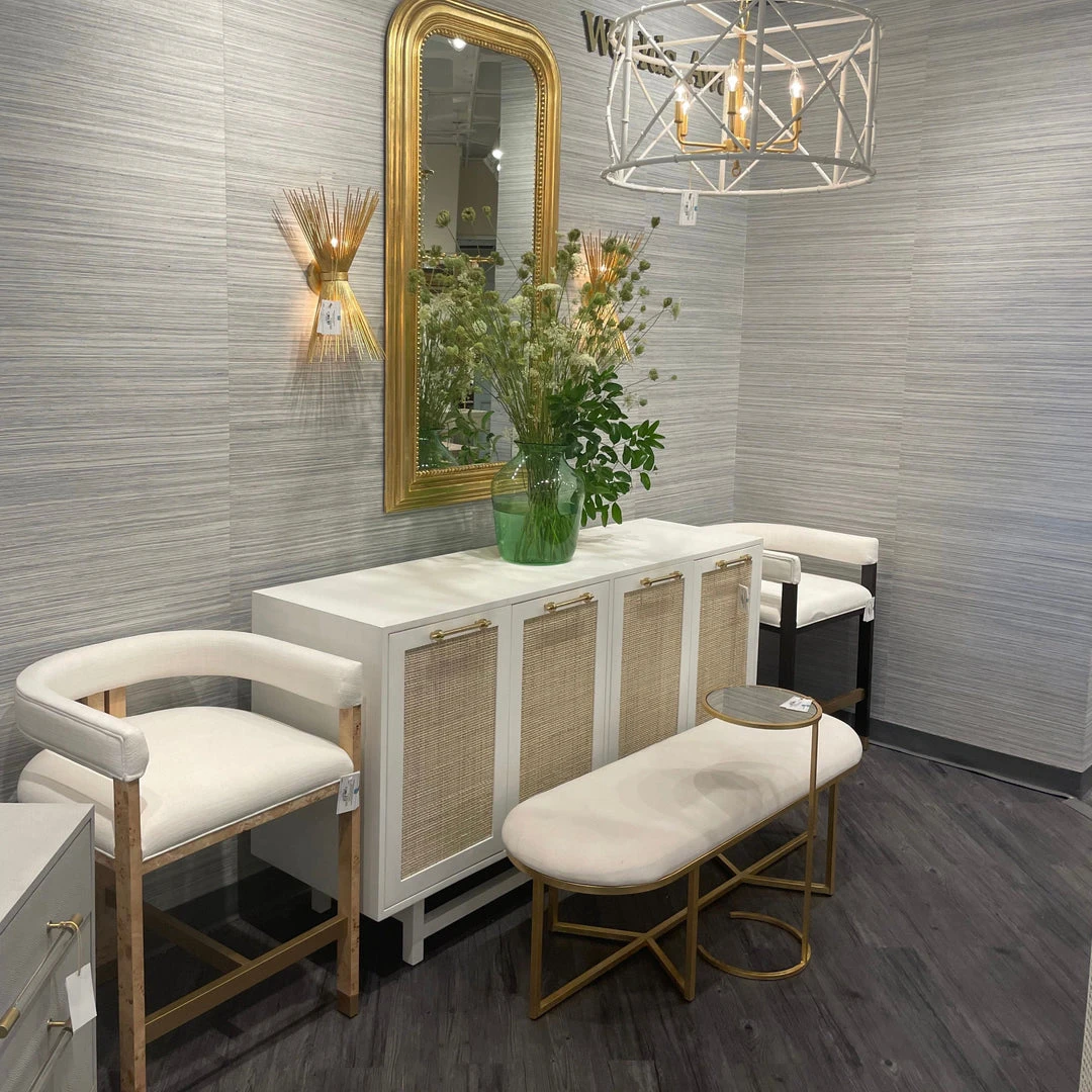 Opulent yet understated, the Tamia Bench in Gold Leaf from Worlds Away features an oval shape with a glimmering gold leaf base and lush white linen cushion top. A true multifunctional piece with pure designer style, the Tamia works well in an entryway, dining room, or living space.